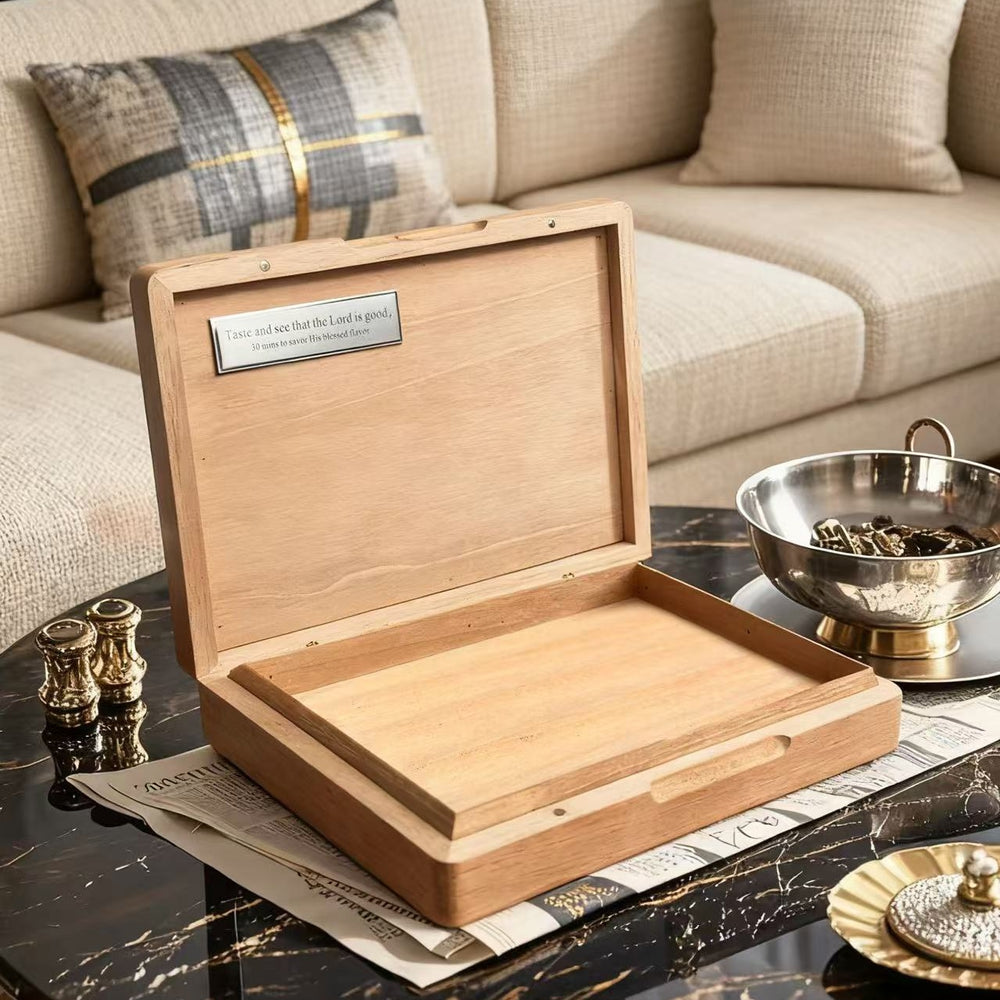 Every cigar is a beautiful creation of God, and every Christmas gift should be filled with filial piety and gratitude. We select natural pinewood for the humidor, featuring a warm texture and excellent breathability. It not only creates a mild environment similar to natural aging for cigars but also echoes the faith pursuit of "a pure and unblemished heart" through the wood's simplicity and purity—just like the character of fathers and elders: steady, reliable, and silently guarding. This Christmas, present this pinewood masterpiece that carries God's gifted flavor to honor their dedication and convey the faith and family love of "cherishing creation and being grateful for companionship."