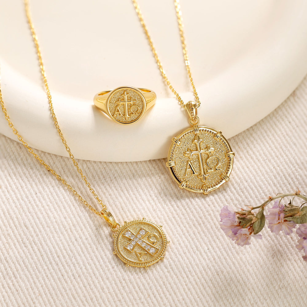 This stunning Alpha Omega Cross Medallion Necklace embodies the timeless symbolism of Christ as the beginning and the end. At the center of the medallion, a sparkling cross is beautifully adorned with pavé-set stones, flanked by the iconic Alpha (Α) and Omega (Ω) symbols, representing the eternal nature of God. Encircling the medallion is a finely detailed intertwining knot, symbolizing eternity and interconnectedness in faith, offering a sense of protection and unity.