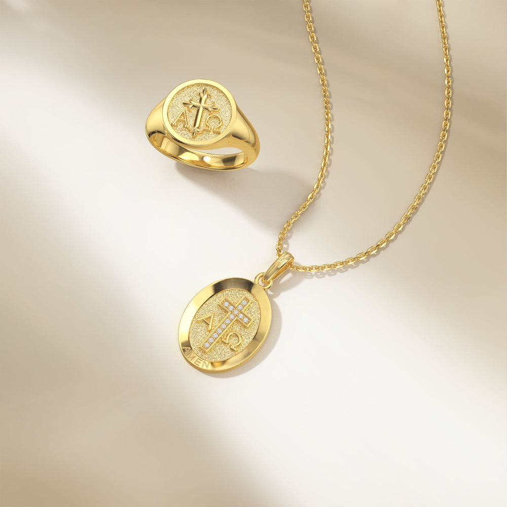 The Alpha Omega Medallion Pendant Necklace beautifully captures the essence of faith with its symbolic design. At the center of this oval medallion, a sparkling cross is flanked by the Greek letters Alpha (Α) and Omega (Ω), representing the eternal nature of Christ—"the beginning and the end." The shimmering pavé-set stones on the cross add a touch of radiance, highlighting the divine significance of this piece. The reverse side of the pendant is engraved with the word “Amen,” a powerful affirmation of faith and belief.