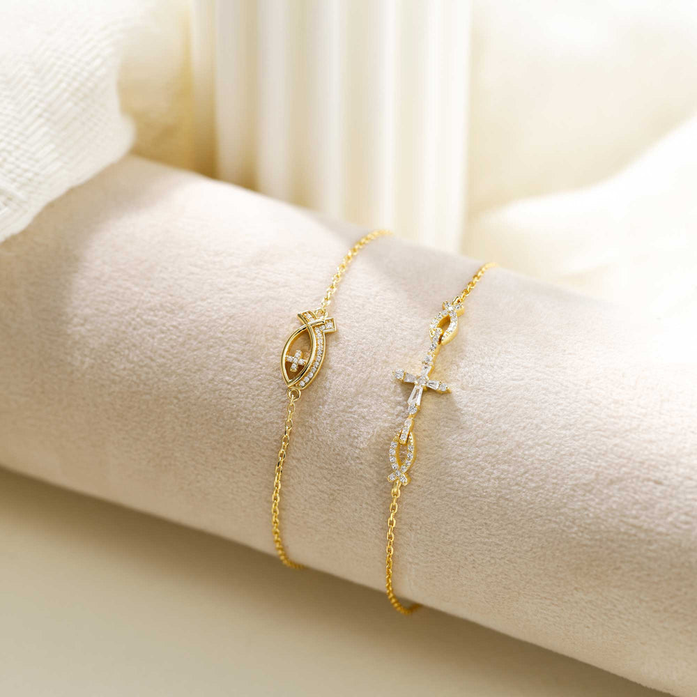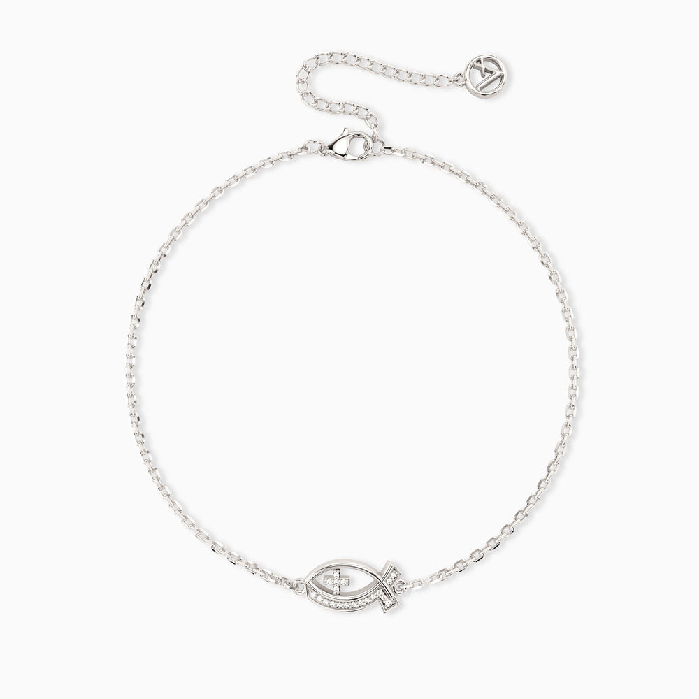 This Anchor of Faith Bracelet beautifully showcases the Ichthys symbol, a timeless emblem of early Christian faith. Crafted with precision, the central Ichthys motif is adorned with delicate stones and features a subtle cross within, symbolizing the strength of belief and the connection to Christ. The sleek and minimalistic design makes this bracelet both meaningful and versatile, perfect for daily wear or special occasions. It serves as a constant reminder of the deep-rooted spiritual journey and the unwavering faith that anchors us in life's challenges. Wear it as a personal testament or gift it to someone who shares this connection to faith and devotion.
