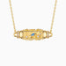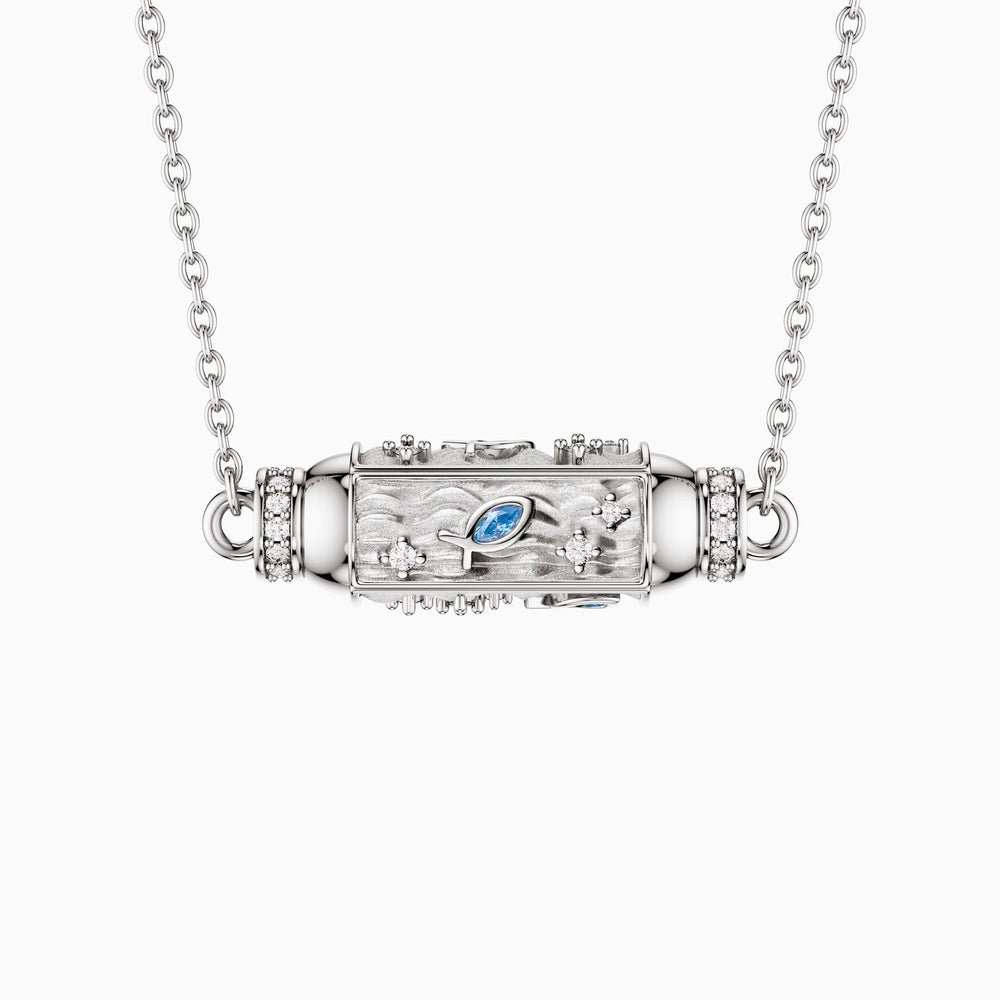 Anchored in joy, each gold-forged wave is a high-five to happiness, while the playful ichthys remind us to swim with the current of life’s most playful moments. The heart of the pendant pulses with vibrant blue stones, the color of boundless skies and deep, mysterious waters, infusing your day with a burst of energy and a touch of serendipity.