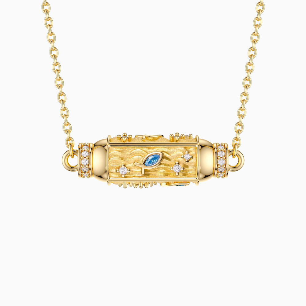 Set sail on a voyage of delight with our 'Aqua Adventures Charm' necklace! This hexagonal haven is where whimsical ichthys leap among the crests of golden waves, encapsulating the serenity of the ocean's rhythm.