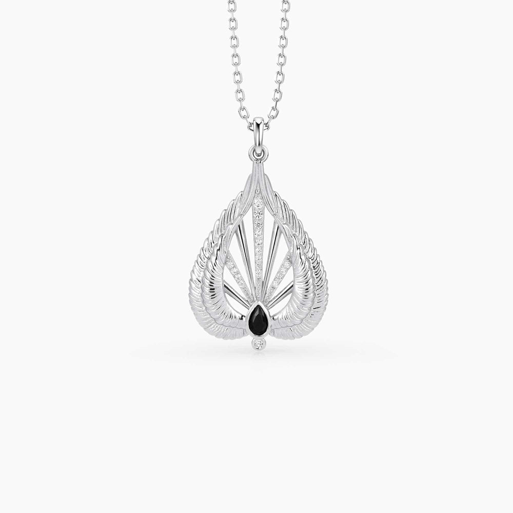 Inspired by the traditional imagery of the Holy Spirit descending as a dove surrounded by seven rays, the Aureola Necklace captures that sacred moment in wearable form. Delicate lines fan outward like wings in flight, embracing a teardrop-shaped black stone—a grounding symbol of quiet strength and inner depth.