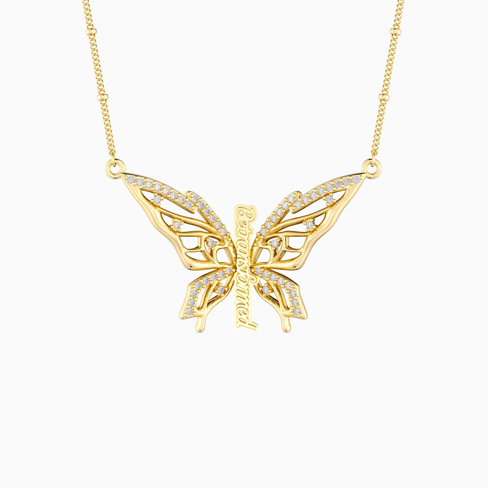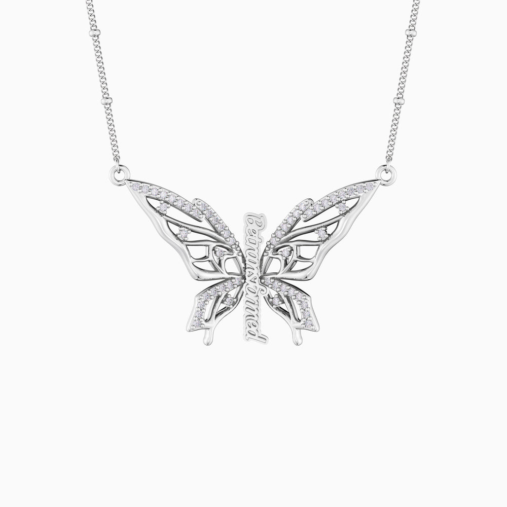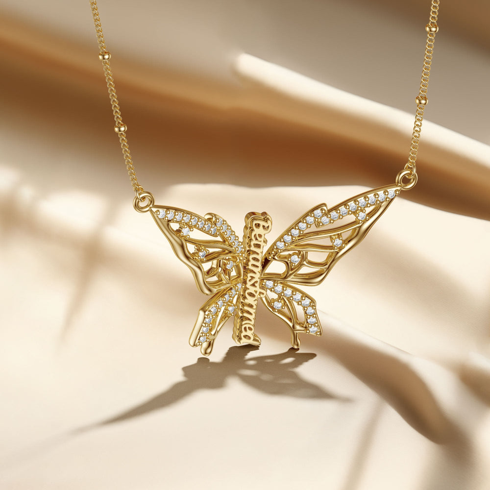 Unveiling the "Be Transformed Molten Butterfly Necklace," a celebration of organic movement and transformation. The design mimics the unrestrained form of molten metal, symbolizing the ever-evolving journey of life. Its wings, detailed with the artistry of liquid form, capture the spirit of metamorphosis.