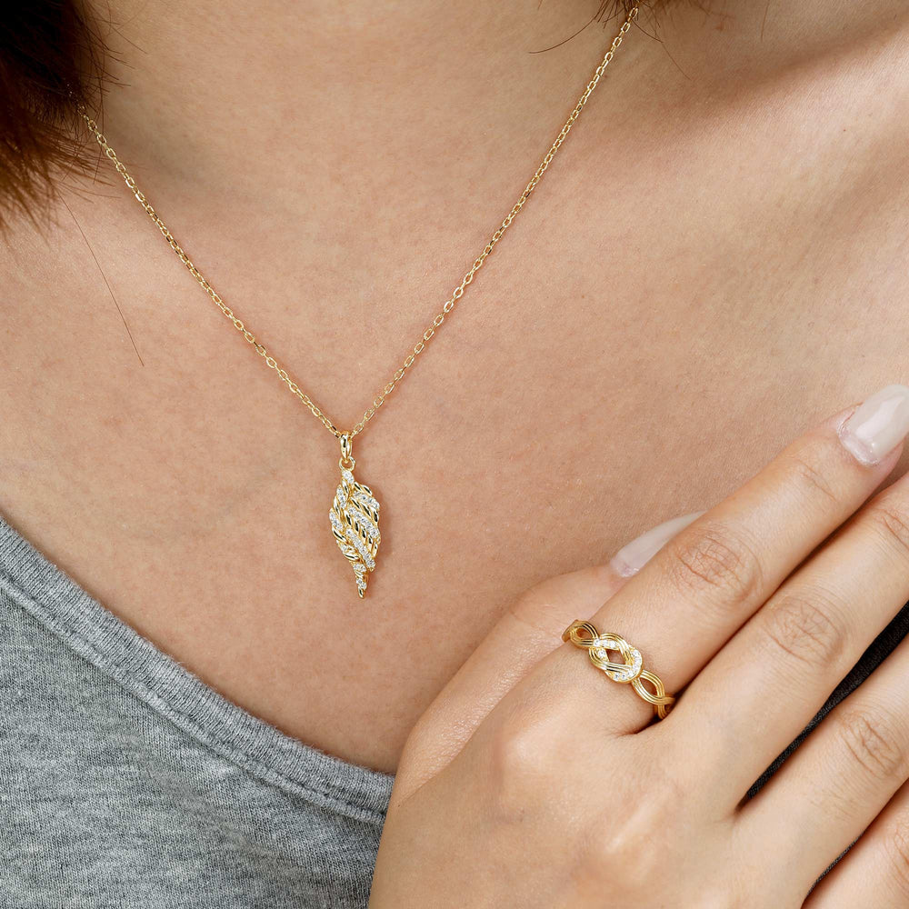 Inspired by the Cord of Three Strands, this radiant wing pendant reimagines strength through flowing, sculpted curves. Braided textures and pavé-set stones intertwine to form a graceful wing—symbolizing protection, hope, and the unseen support that carries us forward.