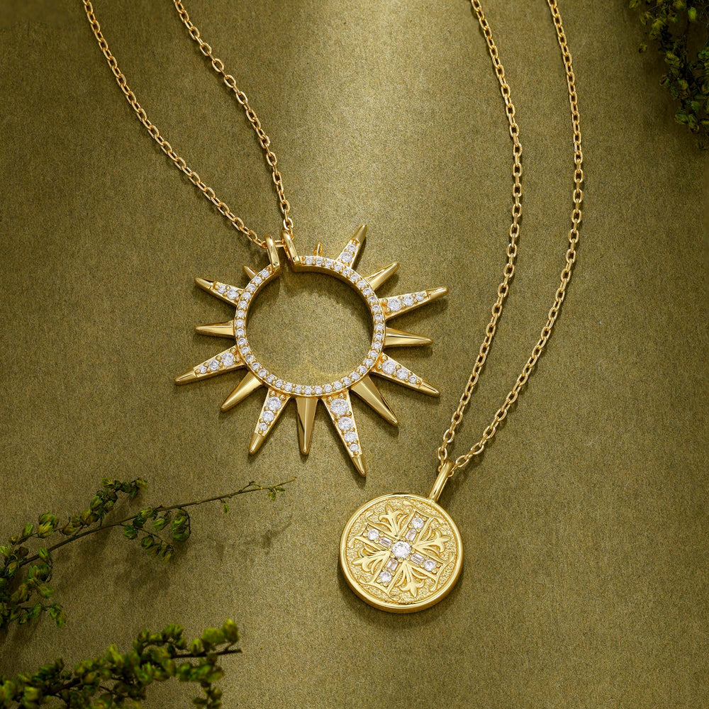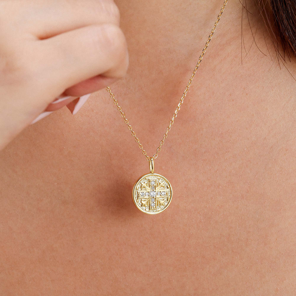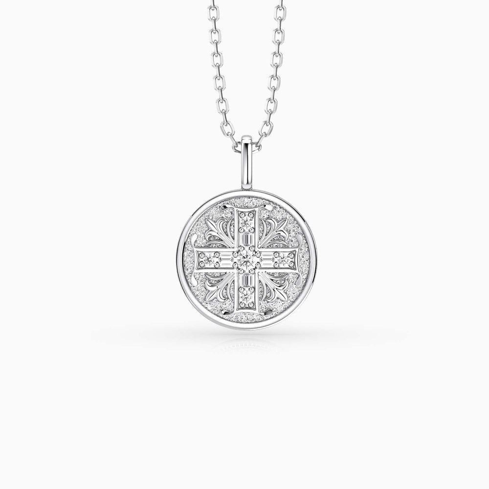 Inspired by ornate Byzantine crosses found in sacred architecture, this medallion fuses timeless symbolism with quiet elegance. The radiant cross at its center—framed by delicate flourishes—evokes unwavering devotion and sacred grounding.