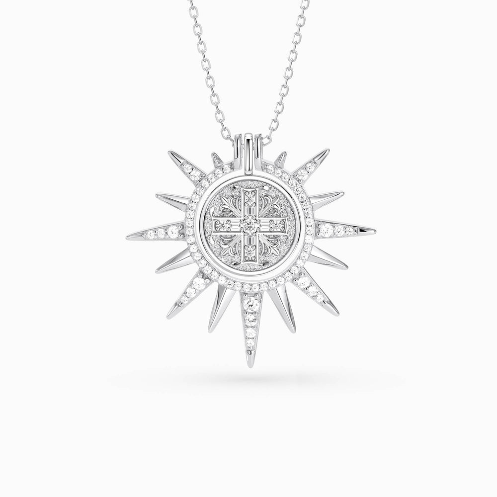 Inspired by ornate Byzantine crosses found in sacred architecture, this medallion pairs timeless symbolism with radiant brilliance. At its center, a finely detailed cross—framed by delicate flourishes—rests within a circular medallion, symbolizing eternity and spiritual grounding.