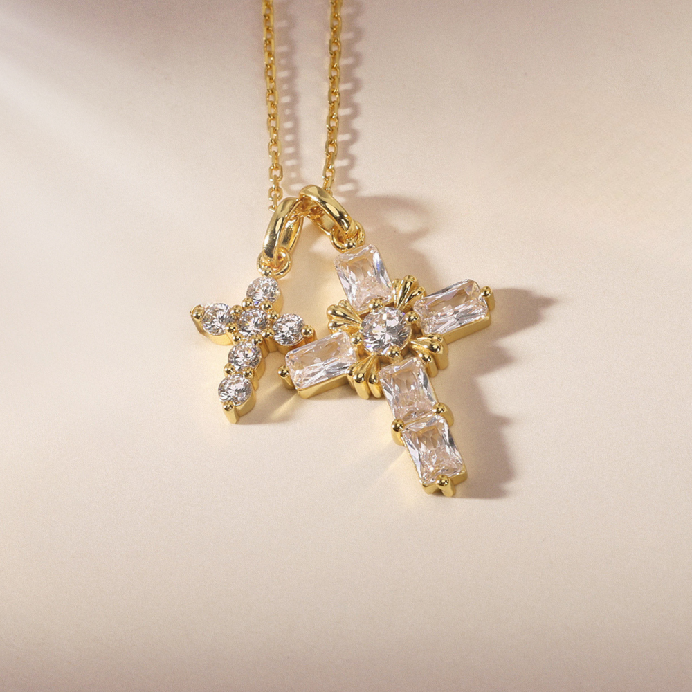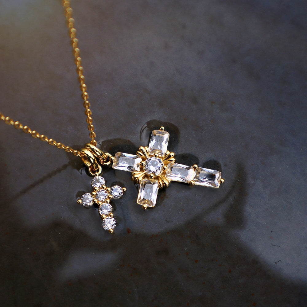 The "Byzantine Double Crosses Pendant Necklace" is a captivating piece that celebrates faith with a contemporary twist. The necklace features not just one, but two distinctive crosses, each bringing its own character to this unique pendant. The primary cross, classic in its silhouette, is elegantly adorned with rectangular and round cubic zirconias, exuding a timeless grace. Alongside it, a smaller cross blooms with a floral design, its petals shining with stones that capture the essence of growth and rebirth.