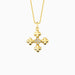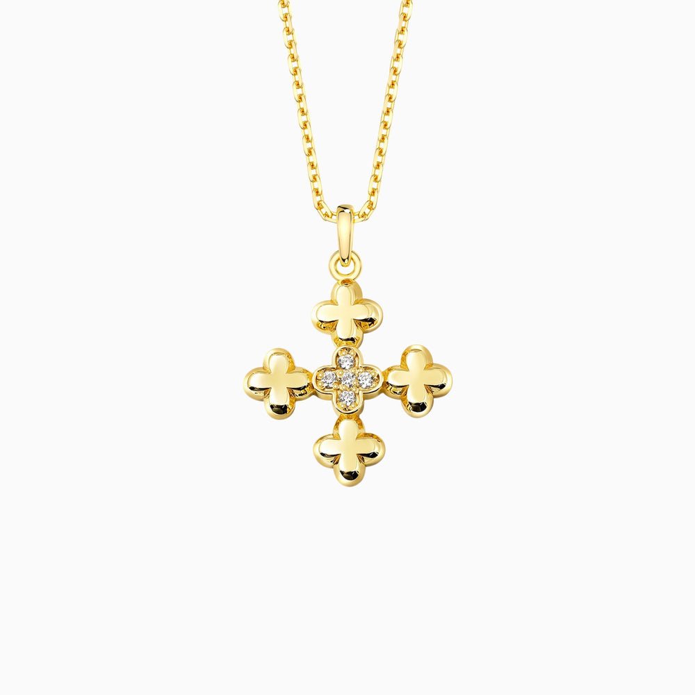 This delicate cross pendant necklace creatively reimagines the traditional cross with a unique design featuring five clovers. The petals of the clovers form the points of the cross, symbolizing faith, hope, love, and divine blessings. At the center, a sparkling stone adds an elegant touch, enhancing the gentle beauty of the pendant. The soft, rounded shapes of the clovers contrast beautifully with the strength of the cross, making this piece both a symbol of faith and a reflection of grace and fortune. Perfect for those seeking a meaningful, feminine expression of spirituality.