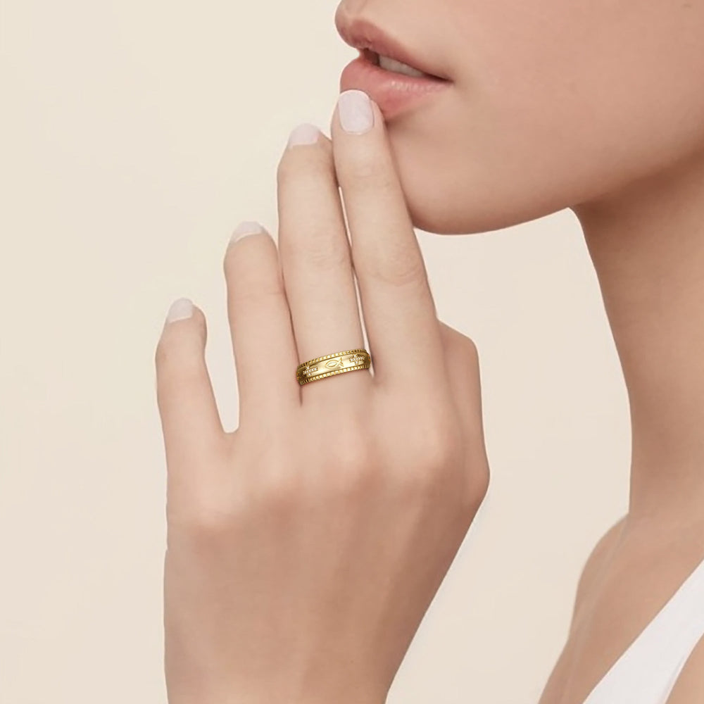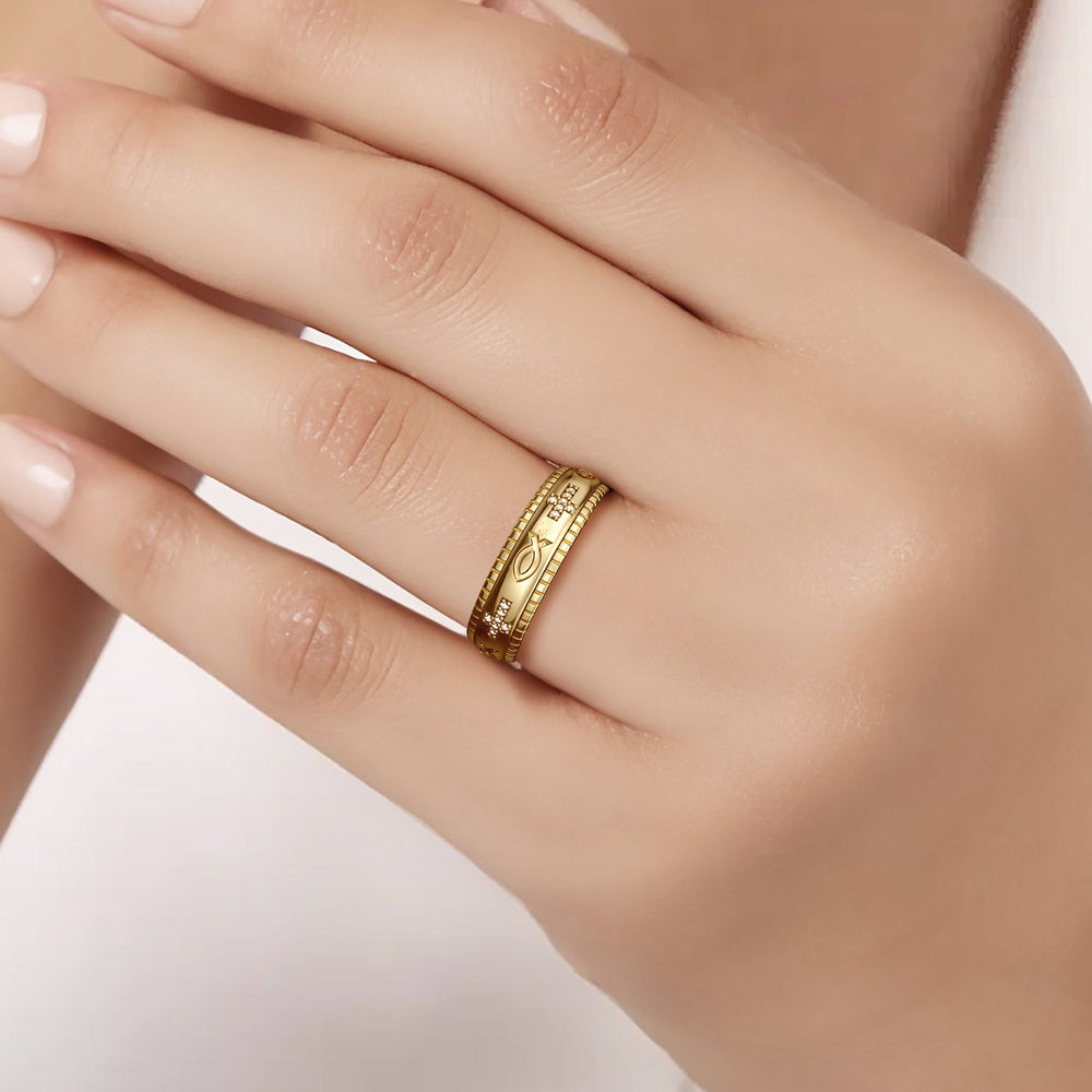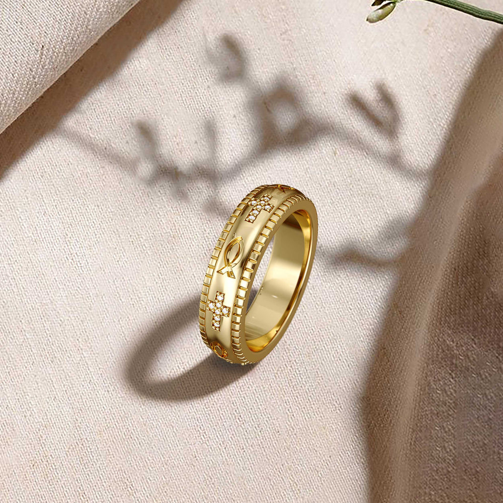 Discover the gentle grace of the Faith Fidget Ring, where timeless symbols of faith—the cross and the ichthys—adorn your hand in a dance of devotion and tranquility. Crafted with precision, this ring invites you to turn its band, engaging in a quiet moment of reflection that calms the mind and centers the soul.
