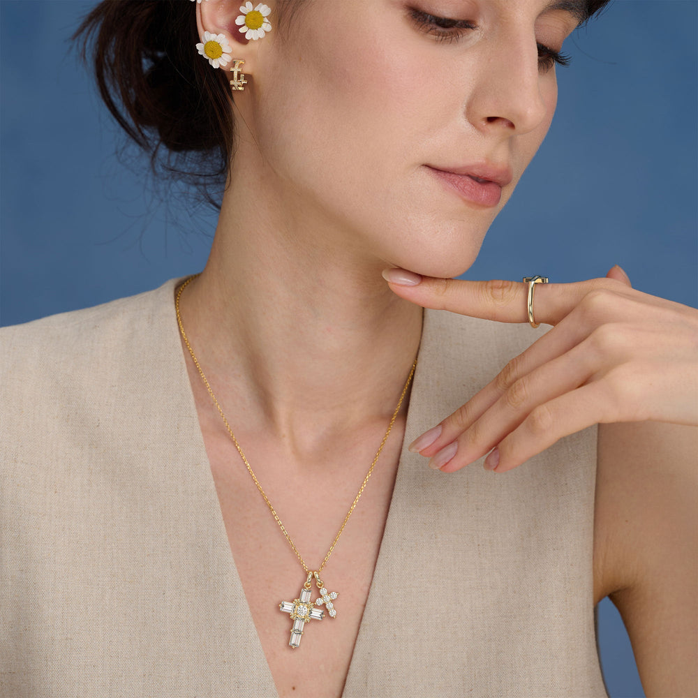This Minimalist Cross Statement Ring offers a sleek and modern take on a timeless symbol of faith. Featuring a bold, horizontal cross design adorned with baguette-cut stones, the clean lines and understated elegance make it a powerful yet subtle expression of spirituality. The simple, refined band allows the cross to take center stage, emphasizing both the beauty and strength of faith in a minimalist form. Perfect for everyday wear or as a meaningful gift, this ring adds a touch of elegance and devotion to any collection.