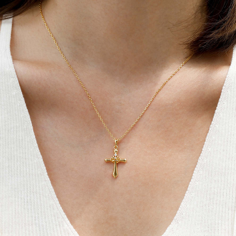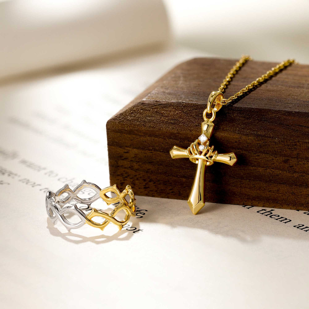 This Cross with Crown Necklace is a powerful emblem of divine identity and inner sovereignty. Sculpted with bold precision, the cross symbolizes faith that grounds you. At its center, the crown—set with a single radiant stone—honors resilience, legacy, and the quiet authority that comes from within.