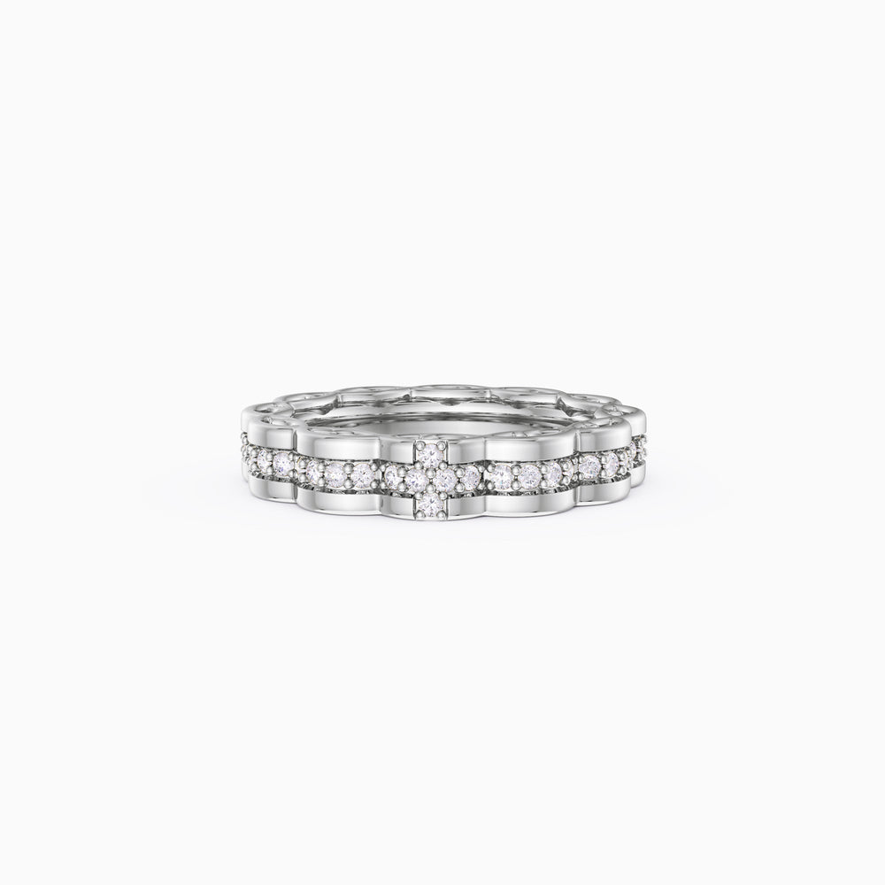 The Floral Thorns Cross Statement Ring merges sculptural elegance with deep symbolism. Viewed horizontally, a delicate cross pattern set with sparkling stones emerges—representing clarity, guidance, and the light we carry within. The band flows in gentle waves, evoking the ever-changing rhythm of life and the grace found in forward movement.