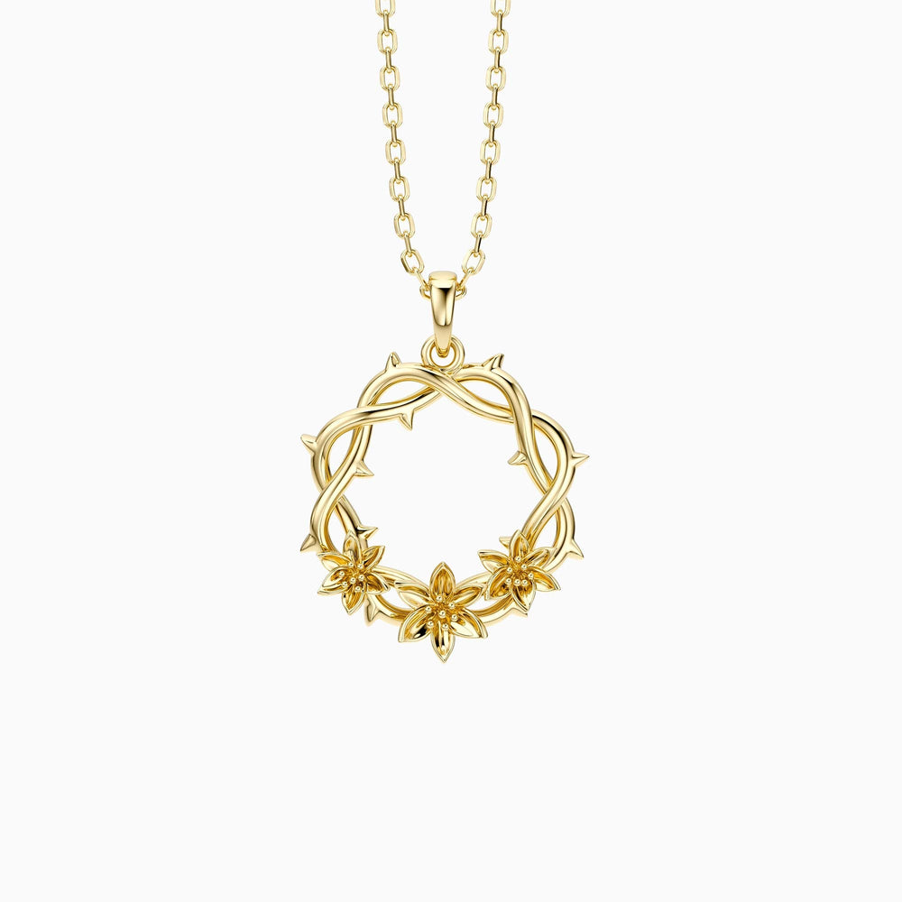 This Crown of Thorns Necklace with three lilies represents the beauty that emerges from struggle, strength, and transformation. The intertwining thorns reflect resilience and protection, while the lilies bloom with hope and renewal—reminding us that grace and growth often rise from life’s most challenging moments.