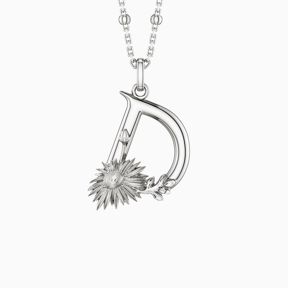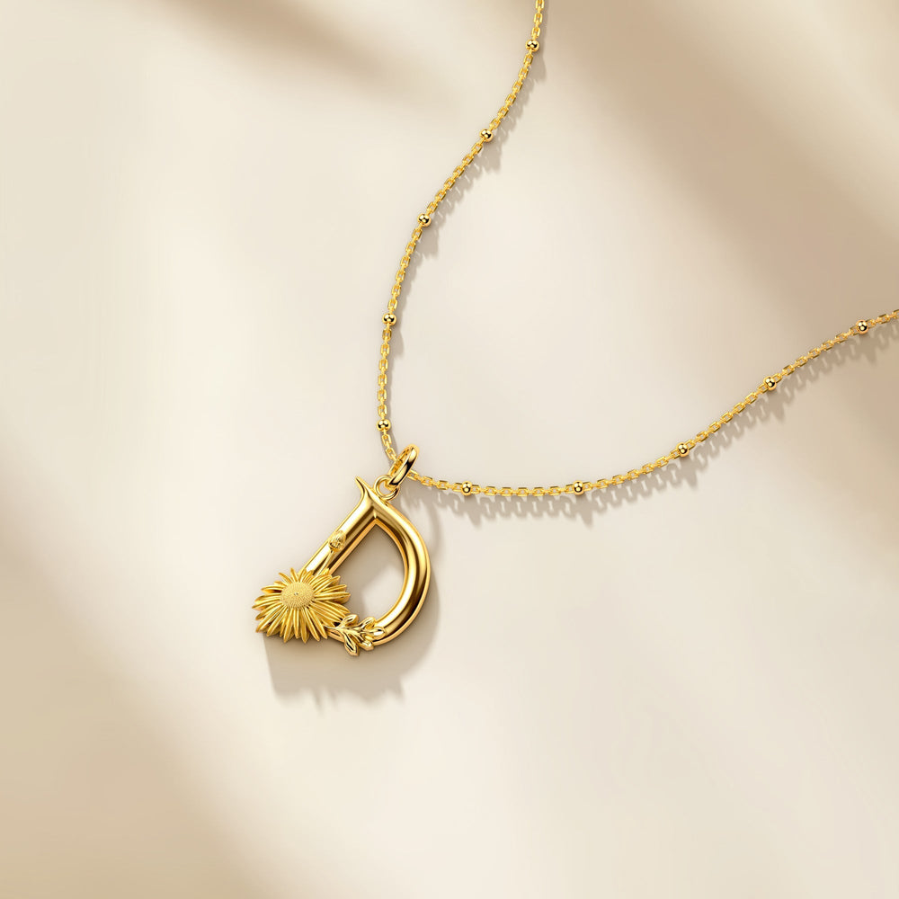 The "Daisy Blossom Letter D Pendant Necklace" exudes a sunny disposition, with a cheerful daisy flower adorning the graceful curves of the letter D. It's a piece that combines the joy and simplicity of a daisy – often associated with innocence and purity – with an elegant and timeless design. The vibrant character of the retro font enhances the pendant's overall allure, making it a delightful addition to any collection. This necklace is perfect for anyone who cherishes the beauty of nature and holds a fondness for the understated charm that flowers bring to our lives.
