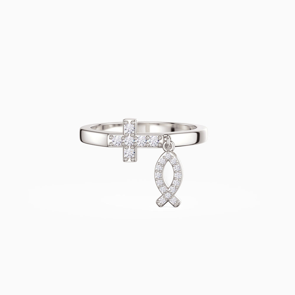 This Dangling Ichthys Cross Ring is a stunning expression of faith, combining two of Christianity’s most significant symbols. At the center of the band sits a cross, beautifully encrusted with shimmering stones, while a delicate Ichthys charm dangles below, adding both movement and meaning. The juxtaposition of the stationary cross and the freely swinging Ichthys creates a dynamic piece that speaks to the balance between steadfast faith and the fluidity of life's journey. Elegant and symbolic, this ring is a powerful testament to spiritual devotion and connection.
