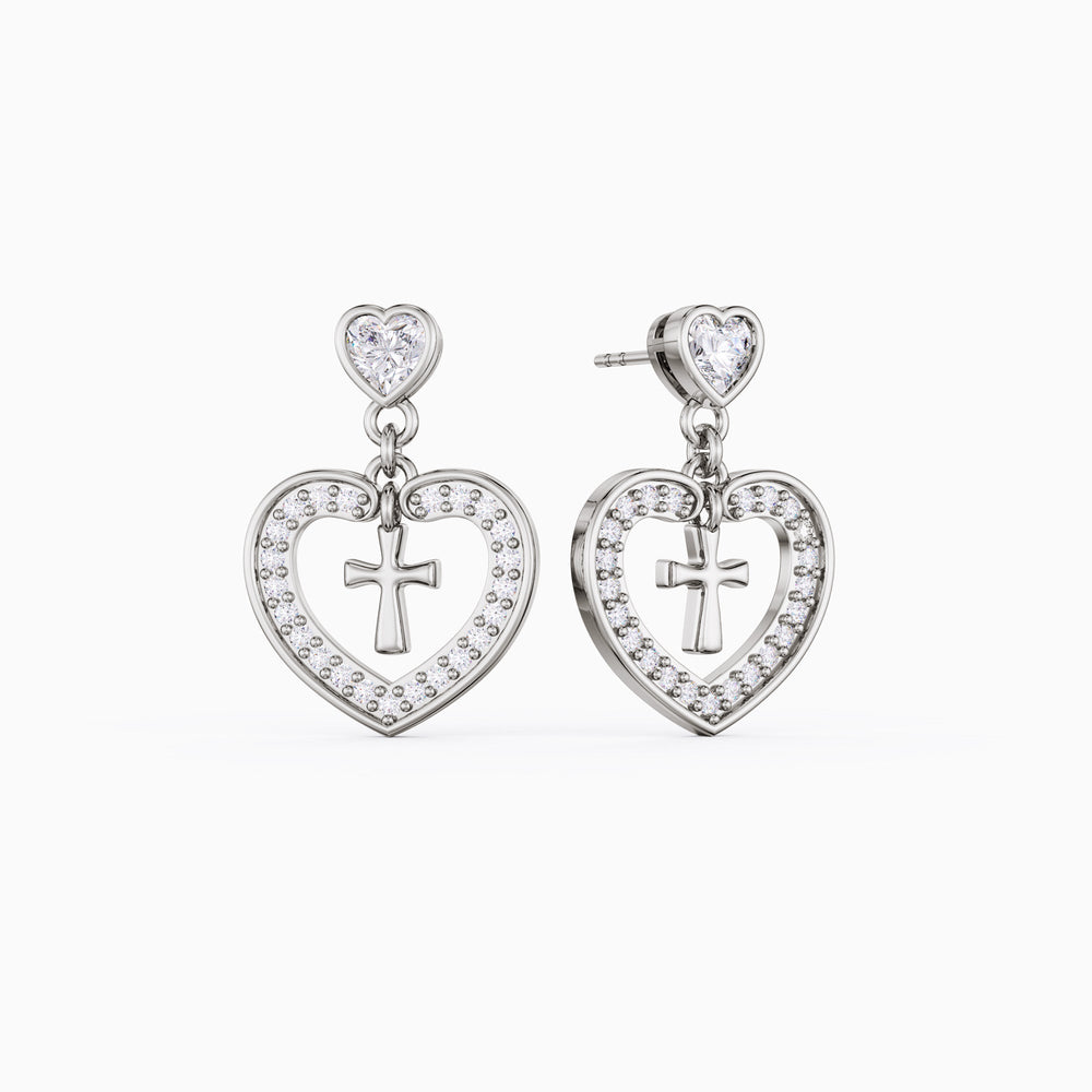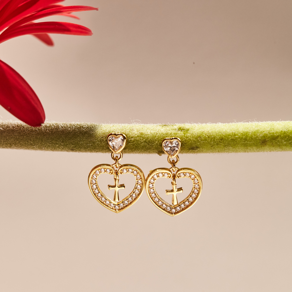 Introducing the "Divine Love Dangling Earrings," where the symbol of the cross dances delicately within a heart, a testament to a faith that moves and breathes with the wearer. These earrings present a symphony of design—heart shapes cradle a cross in their embrace, capturing the profound connection between divine love and human sentiment.