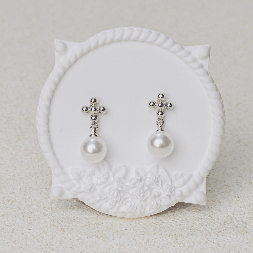 Each earring features a classic cross paired with a luminous pearl drop, representing purity, peace, and faith that endures.