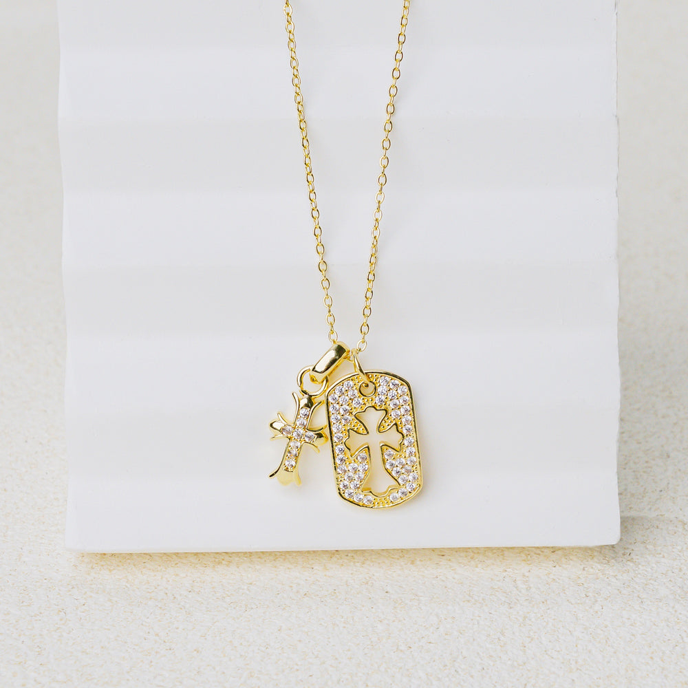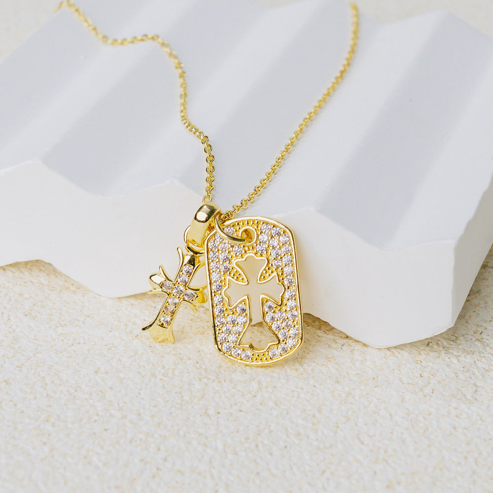 Dual cross pendant design — one crystal-encrusted, one hollow-cut