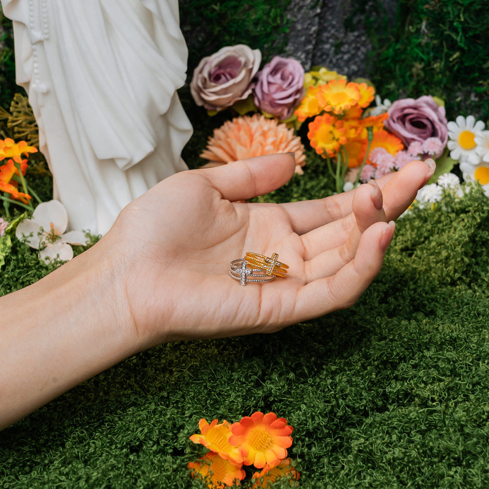 At its center rests a delicately paved cross, shimmering with cubic zirconia stones that reflect a soft, faithful light.Whether you wear it alone or stack it with other rings, the piece adds a subtle statement of belief and style — a perfect balance between modern minimalism and sacred symbolism.Beautifully crafted with a radiant gold or silver tone, this adjustable ring is designed to maintain its shine and comfort for everyday wear. It’s a timeless expression of faith, devotion, and effortless elegance.
