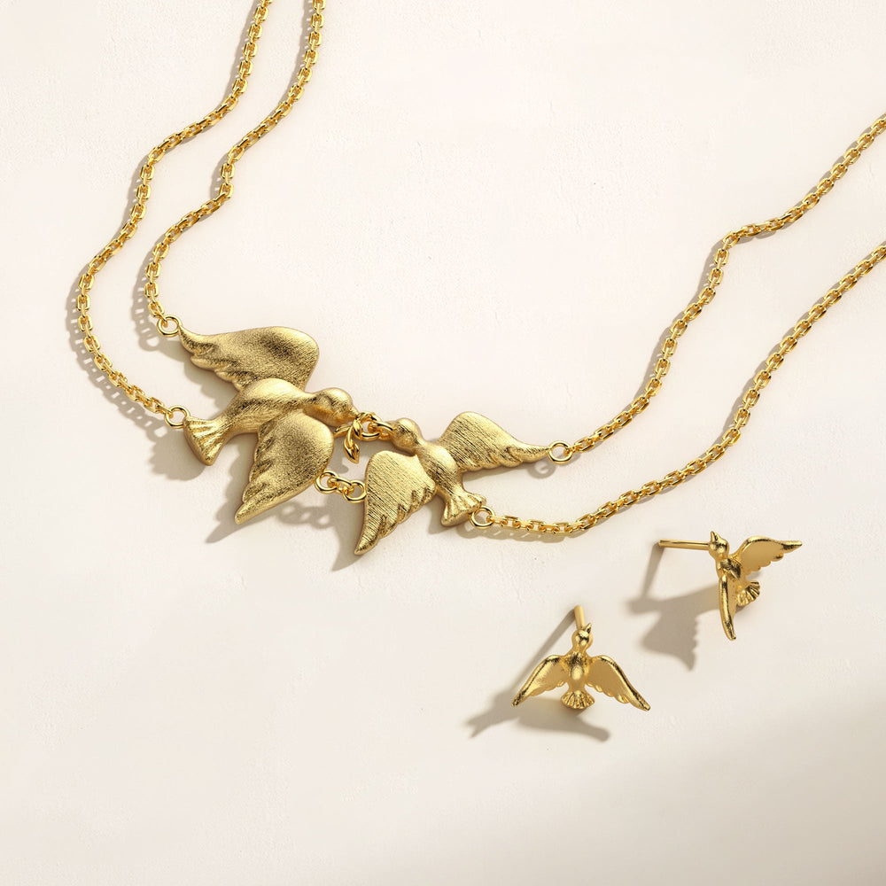 The "Dove Stud Earrings" encapsulate a message of serenity in their artful design. Each earring, sculpted with a dove in mid-flight, carries the timeless symbol of harmony and tranquility. The brushed finish on the gold surface adds a touch of understated elegance, allowing the subtle texture to catch the light and mirror the softness of a dove's feathers.