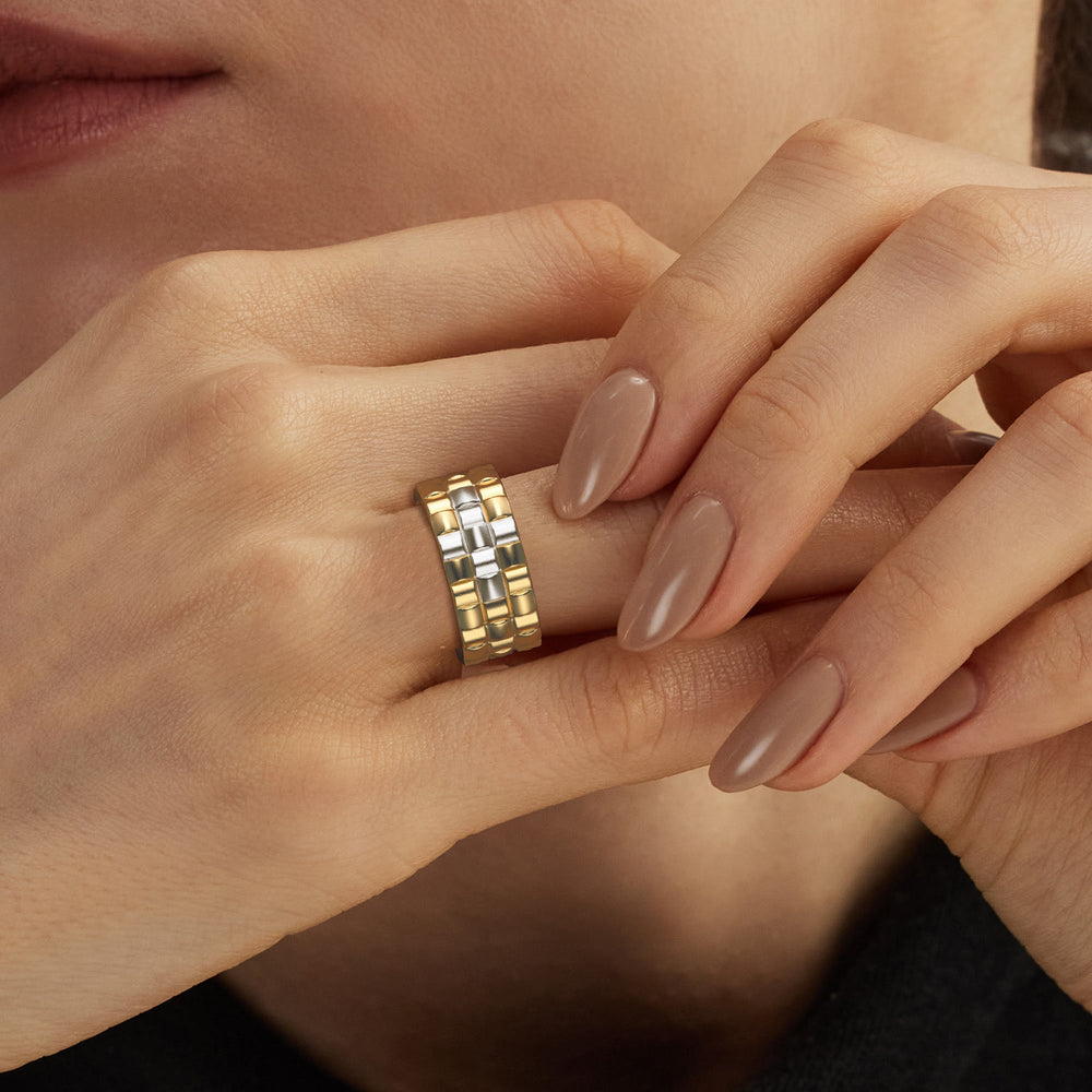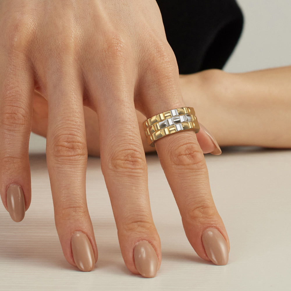 Step into the spotlight with the "Dualtone Dimension" Ring, a statement piece where fashion meets sculpture. The two-tone gold and silver design weaves a tactile tapestry that plays with light and shadow, creating a rhythm that's both seen and felt. Bold and modern, it's not just an accessory—it's a conversation starter, a testament to your impeccable style.