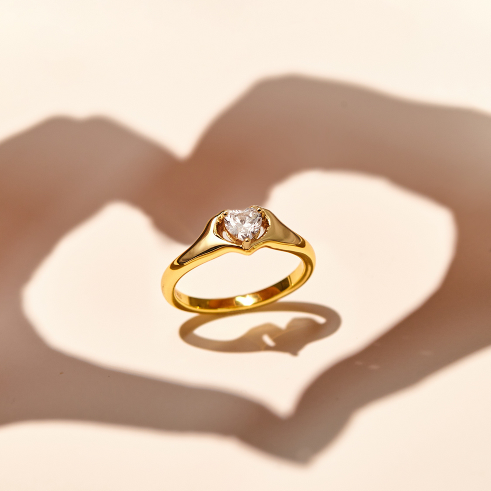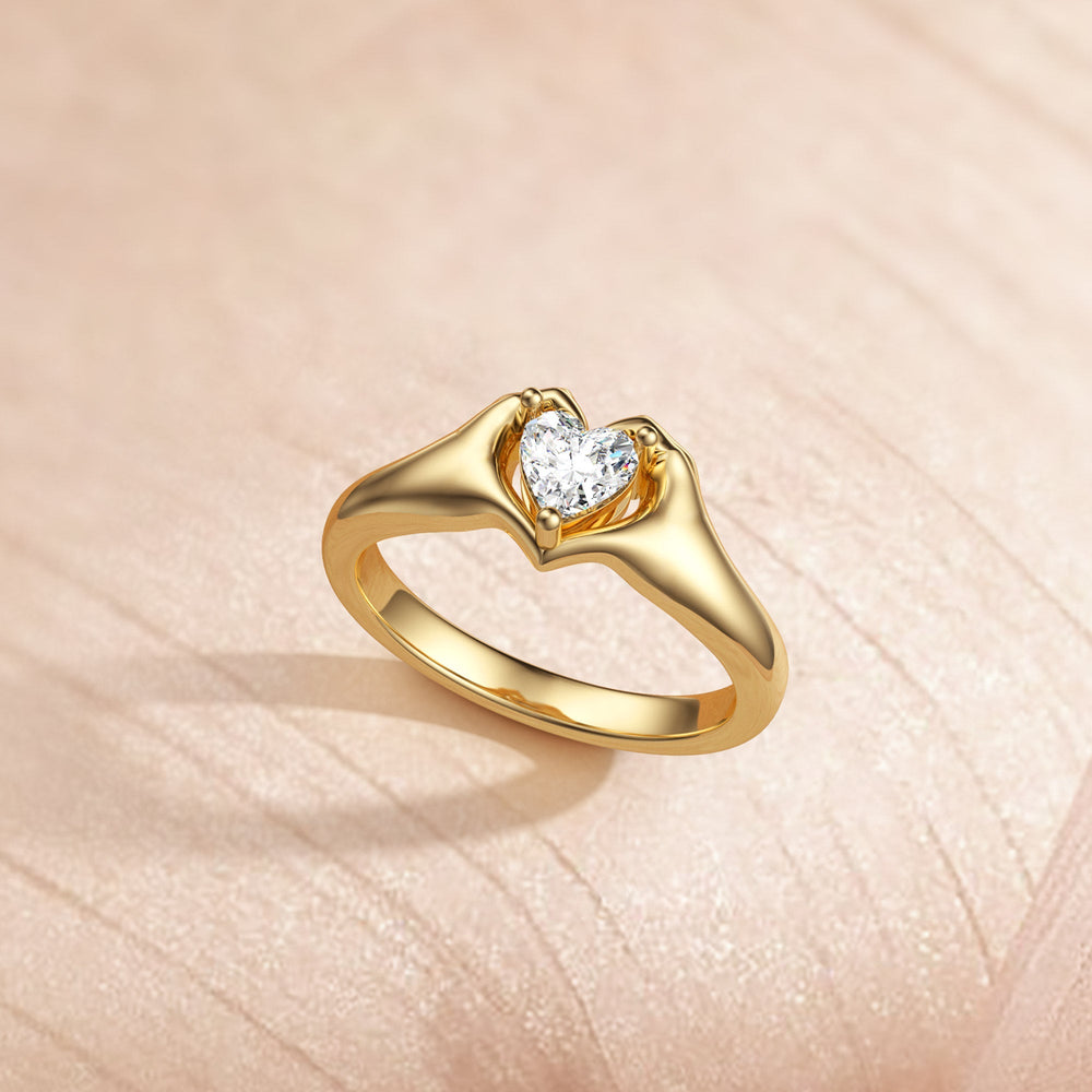 Behold the "Embrace of Affection Love Statement Ring," a delicate piece where two hands unite to form a heart, symbolizing the warmth and shelter of love's tender hold. At the center of this embrace, a heart-shaped stone sparkles brilliantly, as if safeguarded by the gentle touch of devotion.