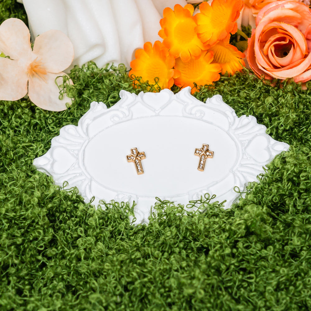 Each earring is shaped into a polished cross, accented with sparkling stones that catch the light like whispers of grace.