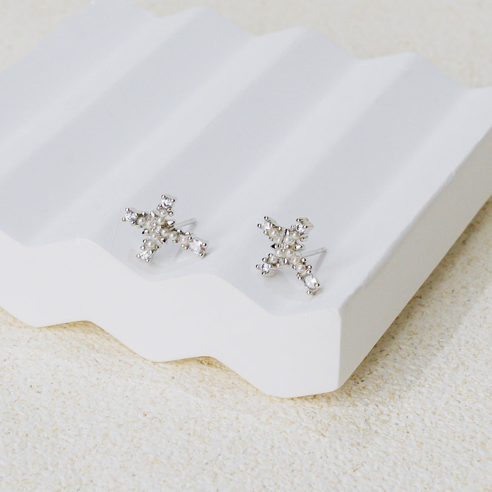 Each stud is delicately set with luminous mini pearls and sparkling zircon stones — reflecting faith, grace, and light in perfect balance.