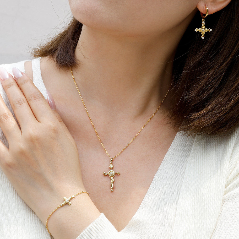 Radiating warmth and grace, the Sunflower Cross Earrings reimagine a timeless symbol of faith with the joyful spirit of the sunflower. Intricately crafted, each golden cross is delicately entwined with sun-kissed floral details and shimmering stones, reflecting both resilience and light.
