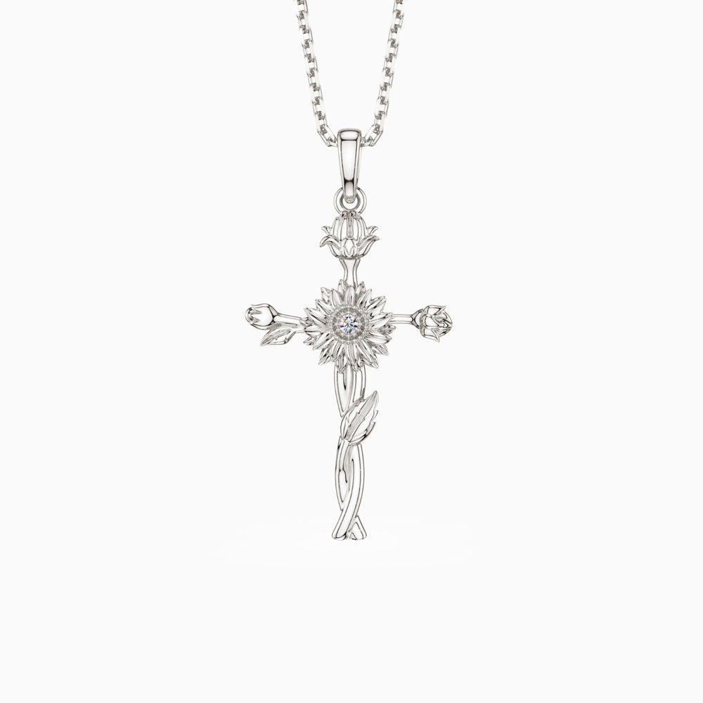 The November feature in our "Floral Cross Collection" is the Sunflower Cross Pendant, an embodiment of positivity, loyalty, and worship. This exquisitely crafted pendant merges the radiance of sunflowers with the sacredness of the cross, symbolizing the believer's devotion to looking towards the light of God, much like the sunflower gazes upon the sun. Sunflowers in Christian symbolism are renowned for representing worship and loyalty, qualities deeply etched within the folds of this design. Adorned with a vibrant stone at its center, the Sunflower Cross Pendant shines as a beacon of hope and guidance, inspiring wearers to embrace the light and warmth in their spiritual journey. This piece serves as a daily reminder to remain steadfast and positive, making it a spiritually enriching addition to any jewelry collection.