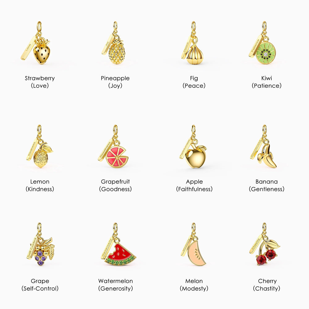 Introducing the delightful "Fruits of the Spirit" Jewelry Collection from Vanimy—where each charming piece symbolizes a unique attribute of spiritual growth and personal virtue. This playful and spiritually enriching collection features twelve beautifully crafted fruit charms, each representing a distinct aspect of the Holy Spirit.