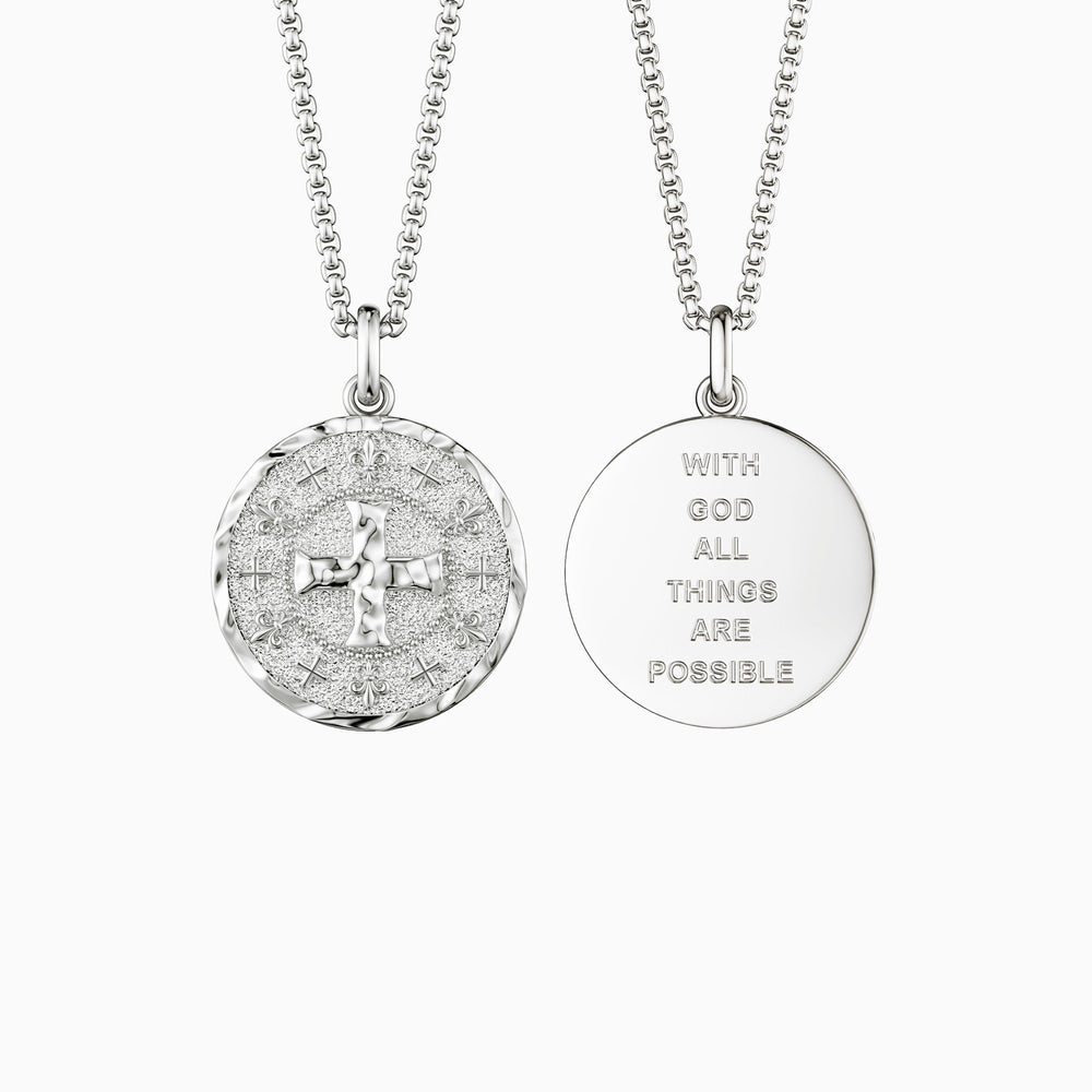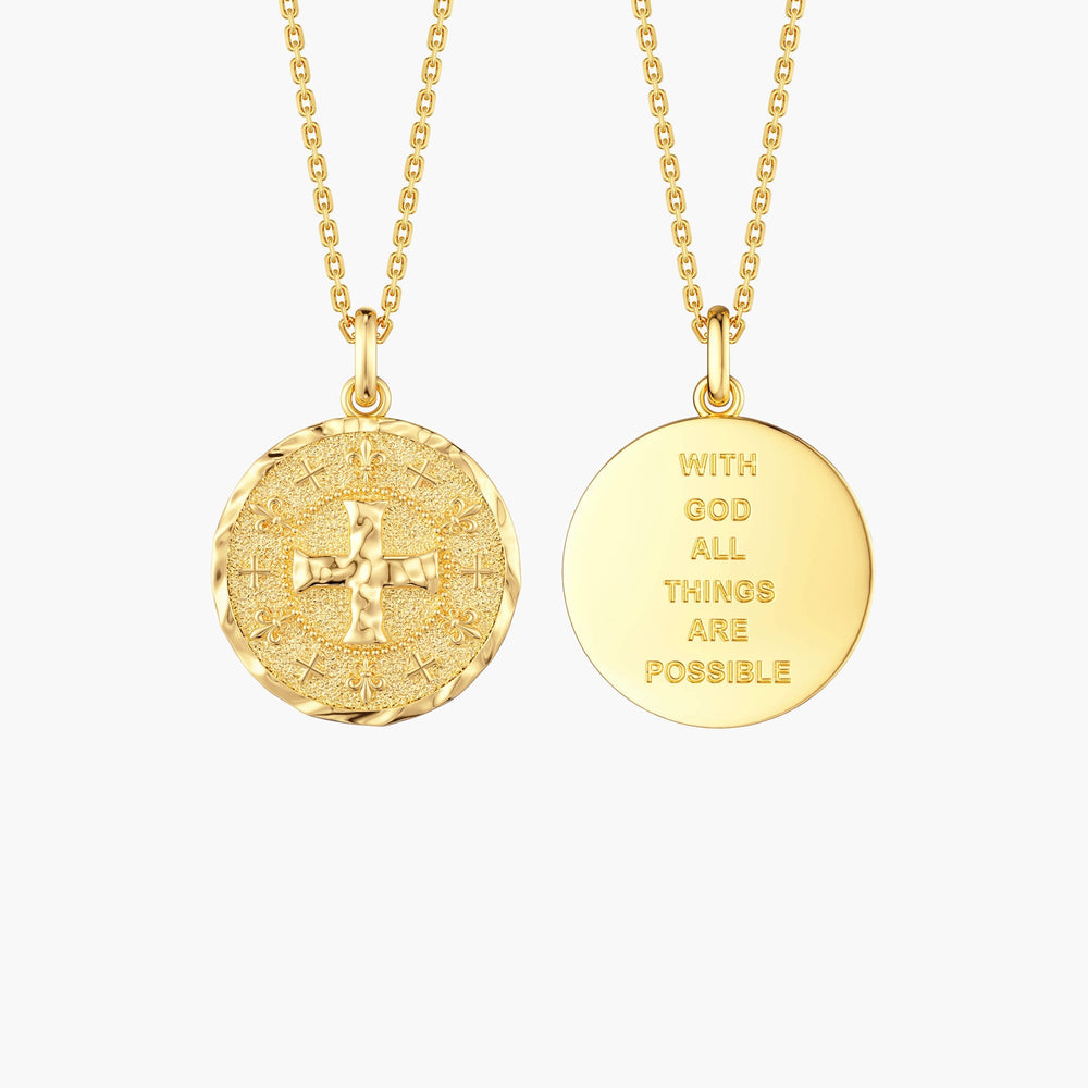 This necklace captures the Gothic era's majestic essence, with each detail accentuating the deep-rooted history and ornate beauty of its inspirations. On the reverse, it carries the empowering inscription, "With God, all things are possible," serving as a personal declaration of faith and a reminder of the boundless potential that accompanies divine belief.