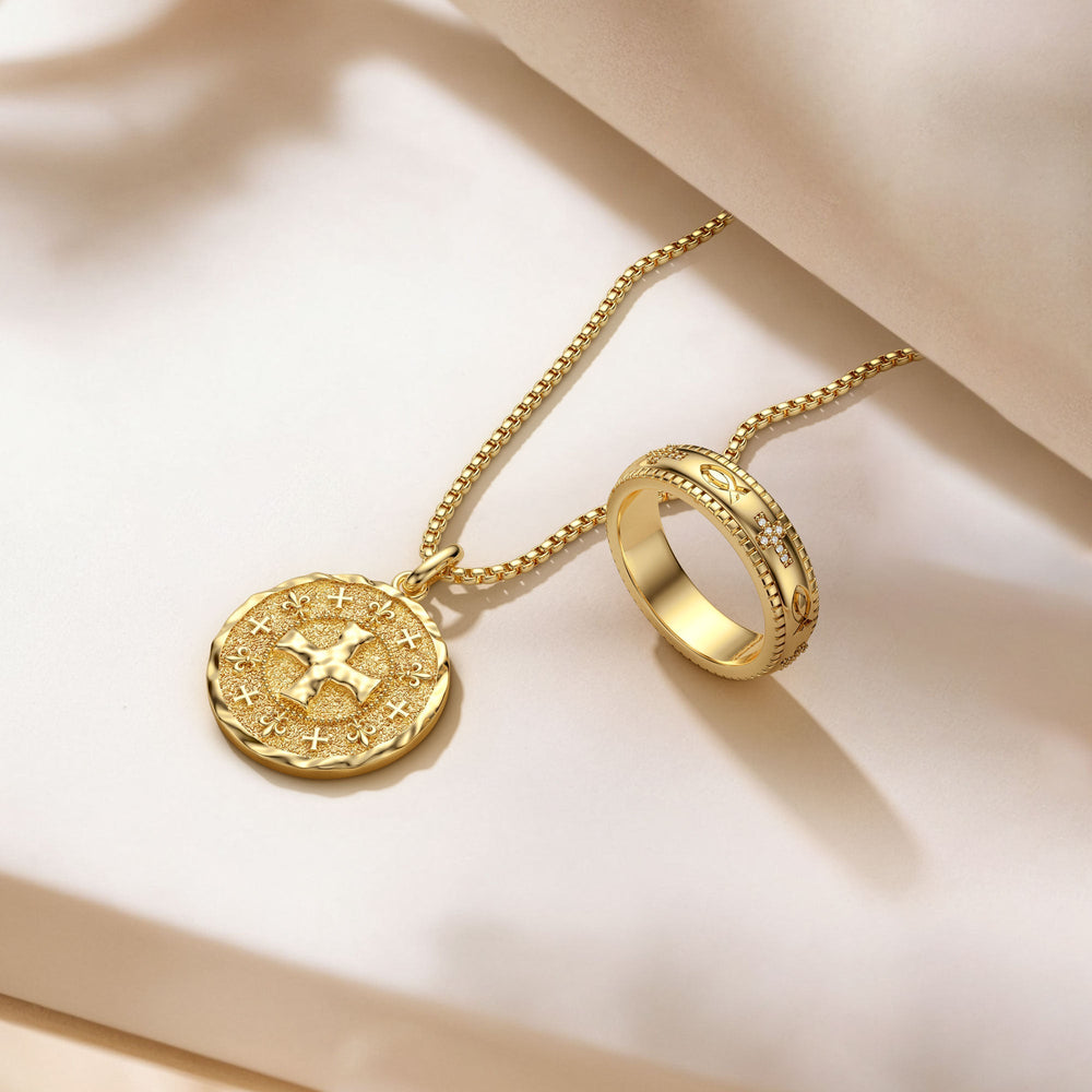 Introducing the "Gothic Liquid Lava Cross Fleur-de-Lis Medallion Necklace," a piece that exquisitely melds spiritual symbolism with artistic heritage. At its heart, the medallion showcases a cross, set against the radiant backdrop crafted in the style of liquid lava, bordered by an ensemble of gothic elements—fleur-de-lis and smaller crosses—that add a touch of venerable grace.