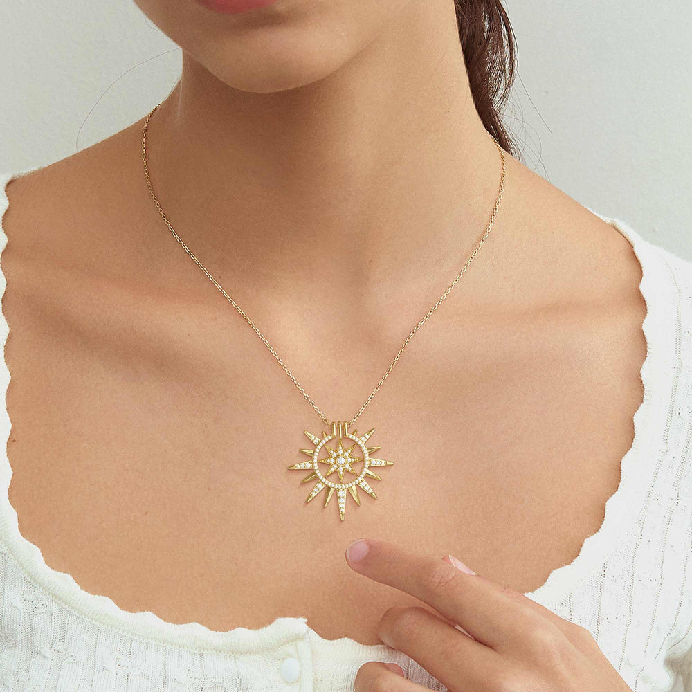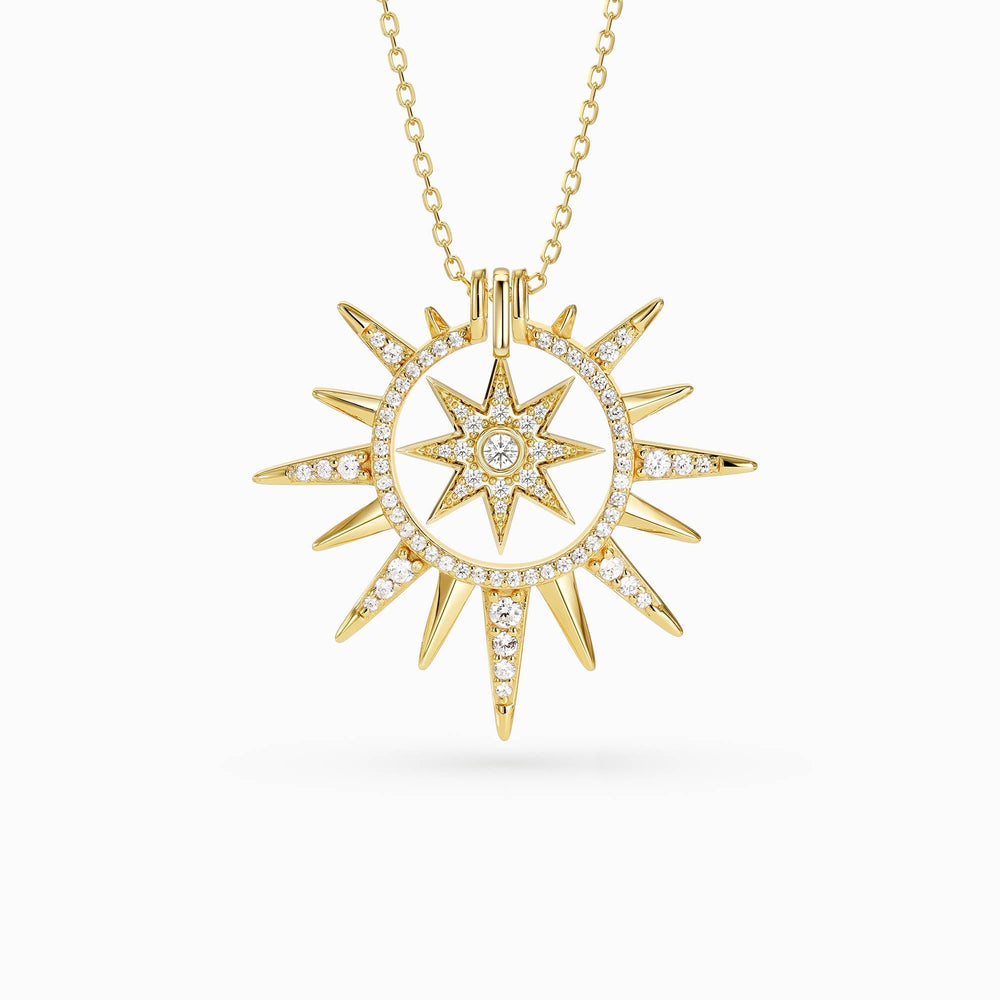 When the path feels uncertain, look to the light that never fades. Centered on an eight-pointed star, this pendant symbolizes shared direction, divine presence, and the invisible bonds that connect us. A brilliant stone at its heart anchors the design, while a halo of pavé-tipped rays extends outward—like a compass you can wear close to your heart.