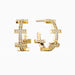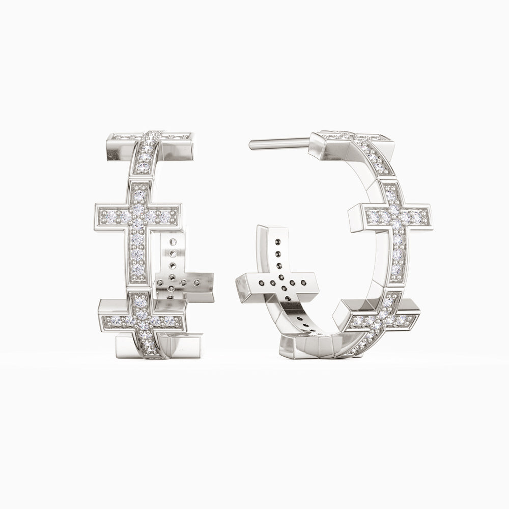 These bold and intricate half-hoop earrings take the form of a series of five crosses, seamlessly connected to create a striking silhouette. Each cross is delicately encrusted with shimmering stones, adding a touch of brilliance to the geometric design. The clean lines of the crosses contrast with the sparkle of the stones, making these earrings both modern and meaningful. The half-hoop shape allows the design to wrap elegantly around the ear, symbolizing faith encircling and protecting you. Perfect for those seeking to make a statement of faith with contemporary elegance.