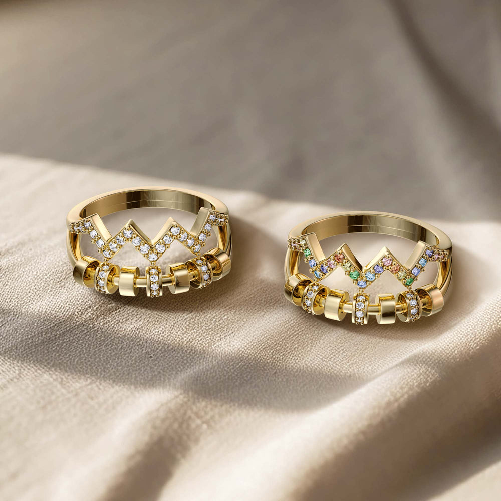 Each high point is set with a radiant zircon in one of the seven hues of the rainbow, a nod to the covenant's colors and a celebration of life's vibrant spectrum. The ring features elegant spinners, providing a soothing outlet for restlessness and anxiety. These moving elements allow the wearer to channel their focus, turning kinetic energy into a moment of reprieve.