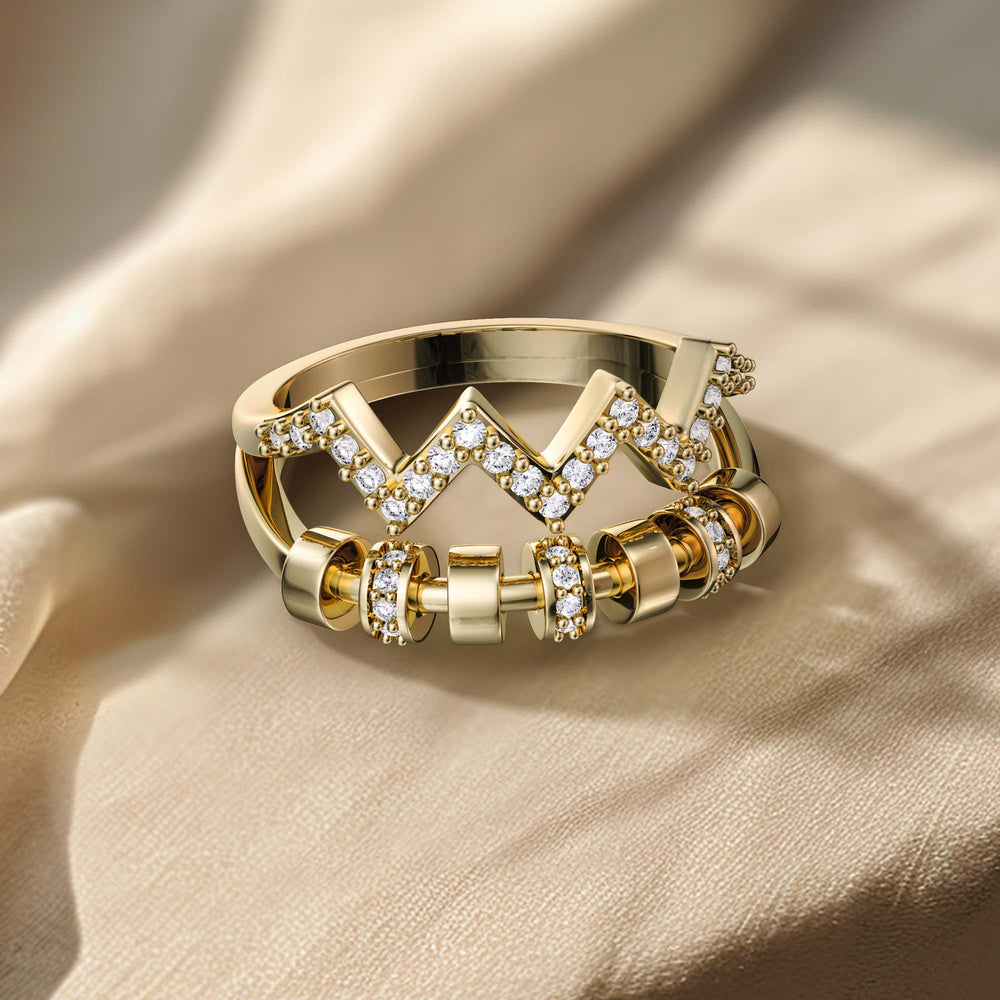 The ring features elegant spinners, providing a soothing outlet for restlessness and anxiety. These moving elements allow the wearer to channel their focus, turning kinetic energy into a moment of reprieve.