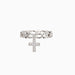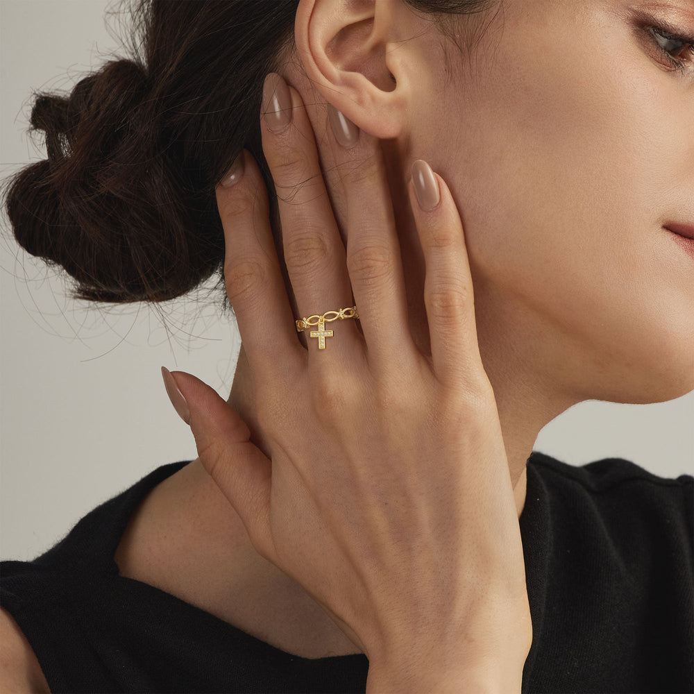 This Ichthys Band Dangling Cross Ring is a beautiful tribute to faith, featuring a band intricately crafted from repeating Ichthys symbols, representing spiritual strength and unity. At the heart of the design is a delicate, dangling cross adorned with sparkling stones, serving as a reminder of divine guidance and protection. The harmonious blend of the Ichthys and cross creates a striking piece, symbolizing the interconnectedness of faith and grace. This ring is both elegant and meaningful, perfect for those who wish to carry a symbol of their beliefs wherever they go.