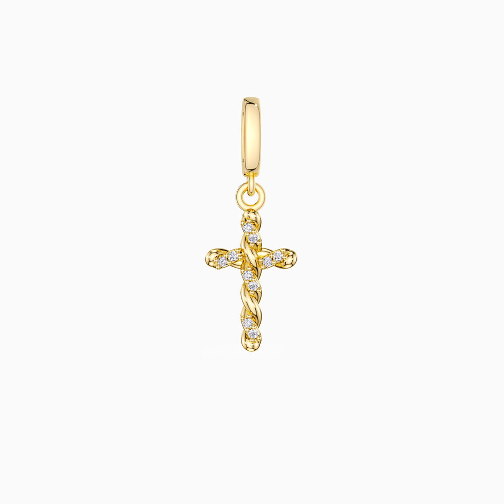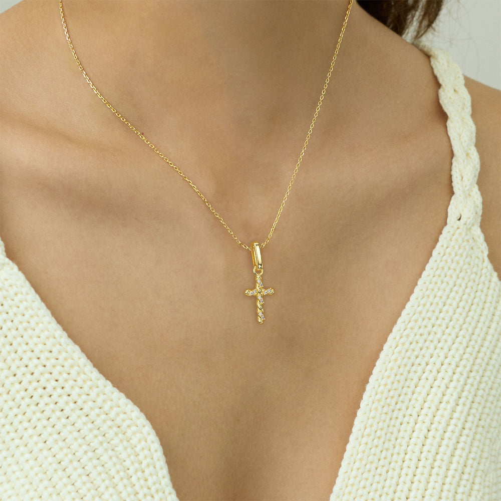 This Knot Cross Pendant beautifully weaves together the symbolism of faith and connection. The delicate knot motif intricately twists along the cross, representing the unbreakable bonds we form with our faith, loved ones, and life’s purpose. Each twist of the knot is adorned with shimmering stones, symbolizing the strength and beauty that comes from being rooted in deep connections—whether spiritual or personal.
