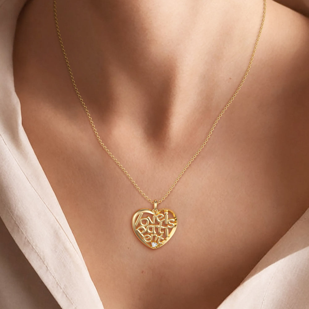Discover the beauty of enduring affection with our "Infinite Love Heart Pendant Necklace" , a piece that elegantly captures the sentiment 'Love is Patient' within the embrace of a golden heart. This necklace is an ode to the gentle strength of love that flows through all our relationships — the quiet understanding between friends, the unwavering support within families, and the deep bonds shared with partners.