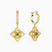 Framed by a delicate milgrain border, the intricate detailing enriches the design with a touch of antiquity, while the sparkling green cubic zirconia at the center of each clover invites prosperity and balance. Dangling gracefully from hoops encrusted with shimmering stones, these earrings offer a dance of light with every movement, a constant play between shadow and radiance.