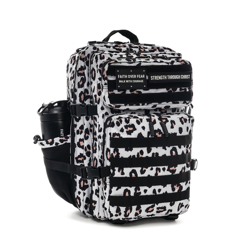 The Mission 45L Active Backpack in Urban Leopard combines a striking monochrome leopard print with a spacious 45L capacity, durable construction, and organized storage—built for daily carry, travel, and active routines while standing out with confident street-inspired style.