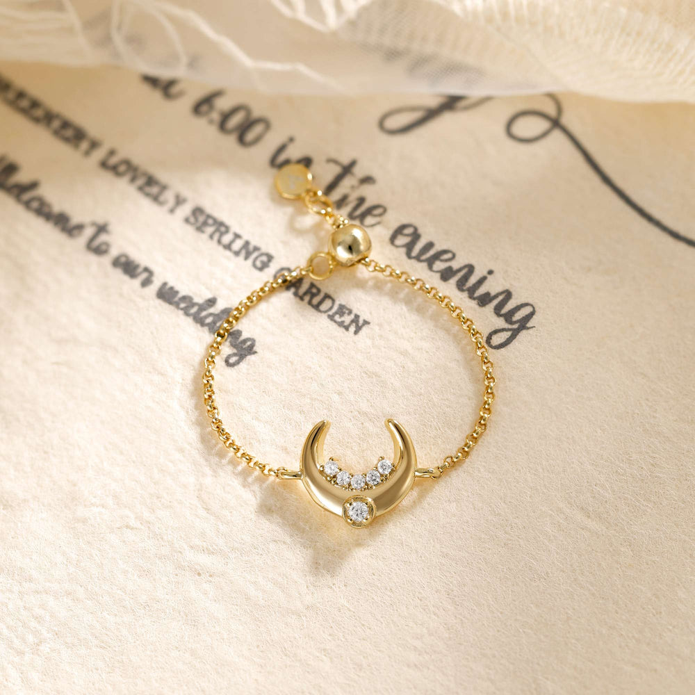 This adjustable chain ring captures the gentle strength of the moon—a reminder that even in stillness, you shine. Pavé-set stones trace the arc of a rising crescent, symbolizing intuition, renewal, and the light that guides from within.