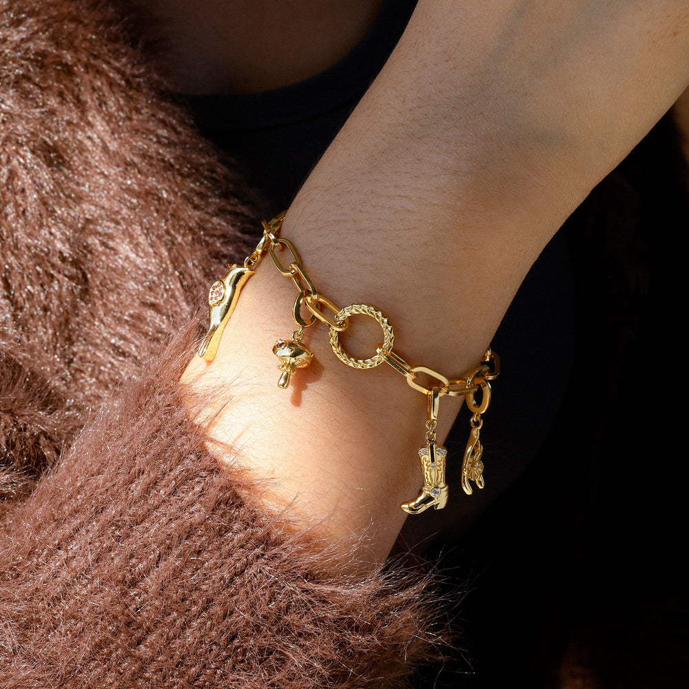 Embrace the whimsical beauty of nature with this Mushroom Charm Pendant. Featuring a delightful mushroom design with a polished gold finish, this charm is accented by a vibrant red stone and subtle detailing that captures the charm of a woodland treasure. The underside is adorned with a delicate ruffle, adding a playful touch to its design.