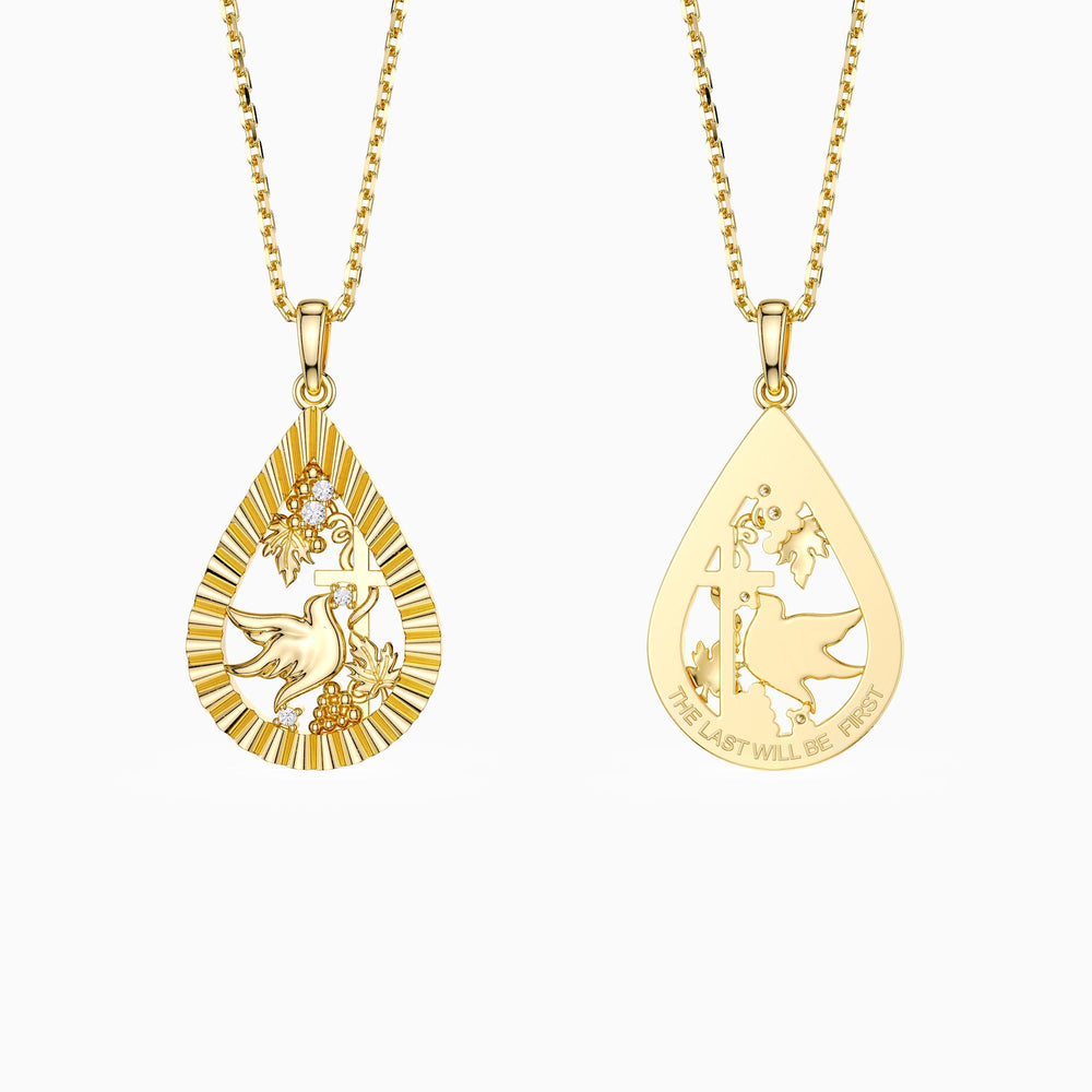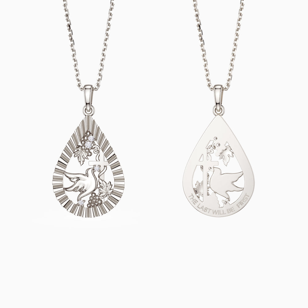 The Parable of the Workers in the Vineyard Dove Cross Pear Pendant Necklace is a celebration of divine generosity and fairness, forming a key piece in the Promised Land Collection's second series, inspired by the parables of Christ. This pear-shaped pendant draws from the Parable of the Workers in the Vineyard, a teaching that highlights the boundless grace of God, which is extended to all, regardless of when they begin their spiritual journey.
