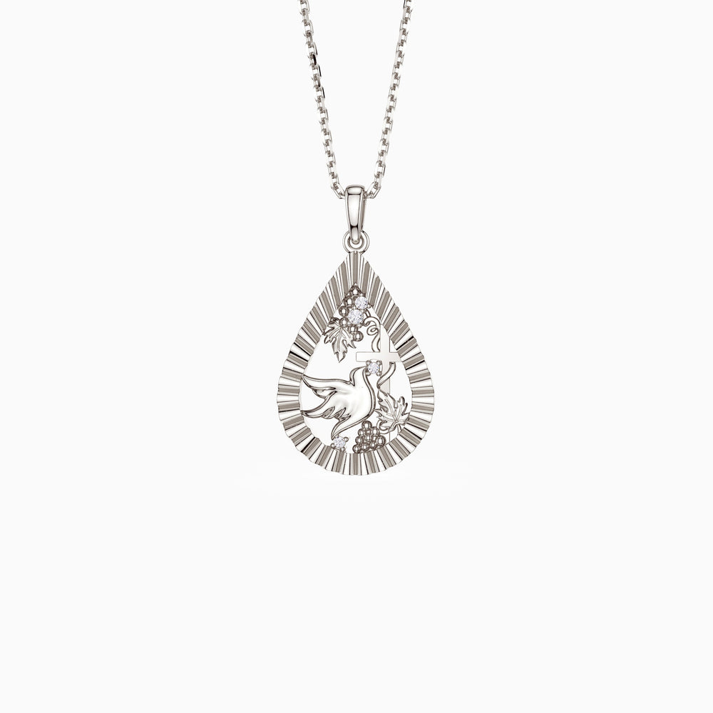 The pendant features a delicate dove and cross motif intertwined with vines and grapes, symbolizing peace, faith, and the fruits of divine labor. The pear shape represents growth and abundance, reflecting the flourishing rewards that come from God’s grace. This design serves as a reminder that spiritual rewards are not based on the length of the journey but on the sincerity and devotion with which it is pursued.