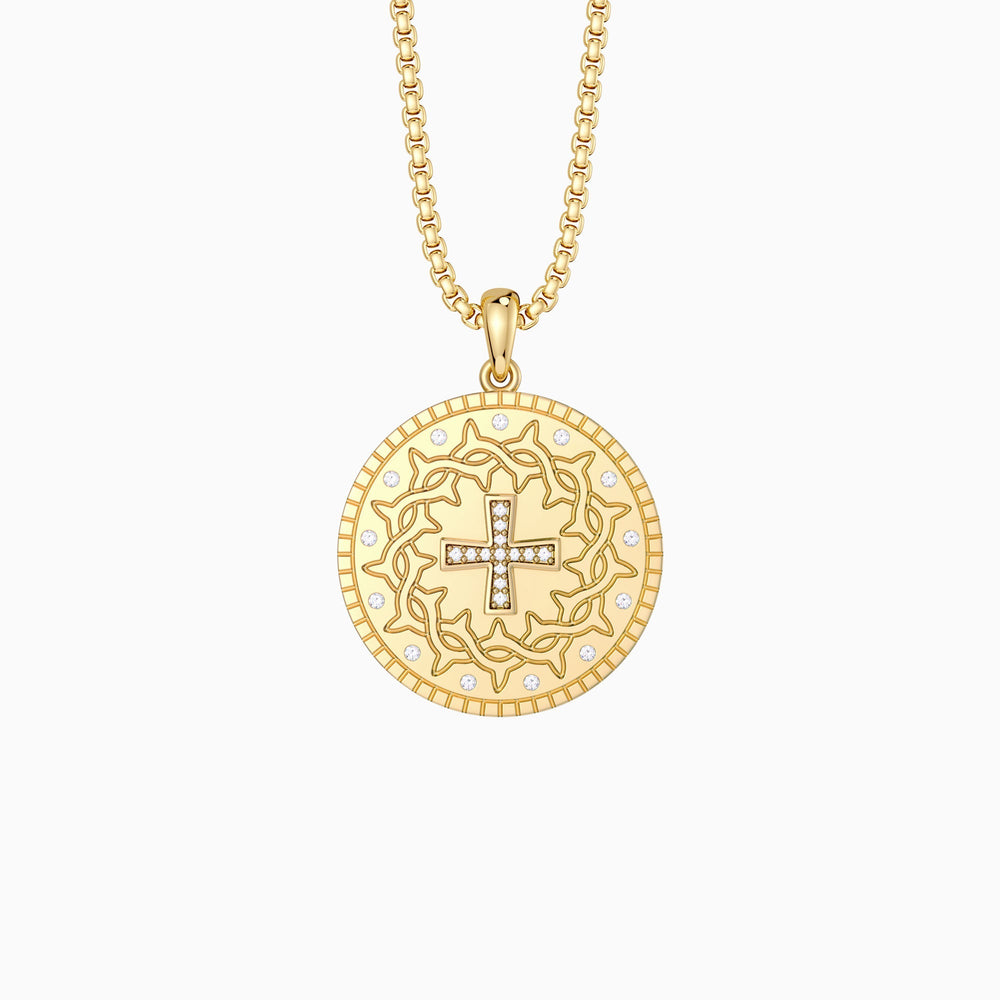 Introducing the "Personalized Cross Crown of Thorns Medallion Necklace," , a piece that captures the intersection of divine grace and human faith. At the heart of this golden pendant sits a cross, a timeless emblem of hope and salvation, encircled by a meticulously engraved crown of thorns, symbolizing the trials and triumphs of faith.