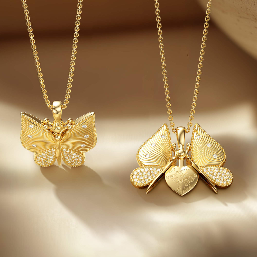 Discover the "Personalized Metamorphosis Butterfly Engraved Necklace," a celebration of rejuvenation and the beauty of spring. At first glance, this exquisite necklace reveals a butterfly in mid-flight, its wingspan detailed with precision and grace, the symbol of transformation and new beginnings.