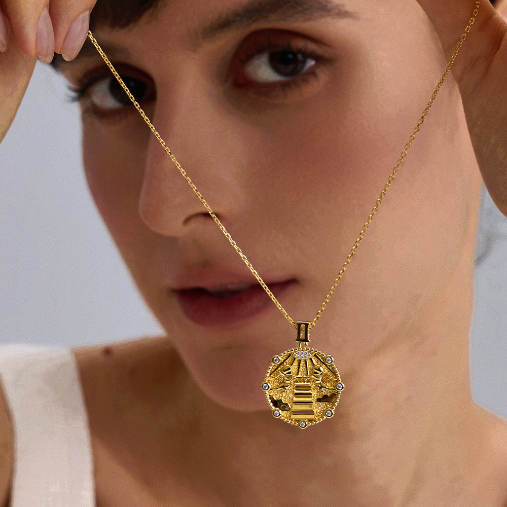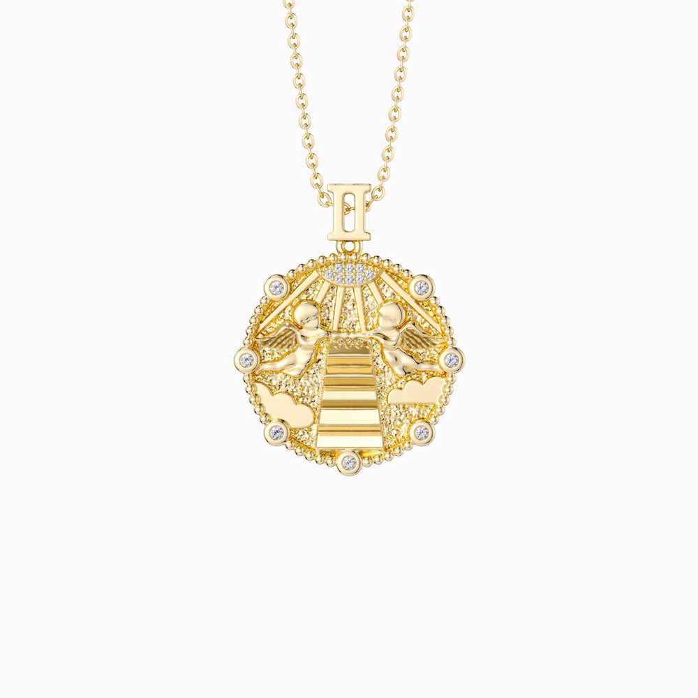 This golden medallion is intricately detailed, capturing the awe-inspiring ladder motif that invites reflection on the ascents and descents of our own lives, and the ever-present link to the divine support above us. It's a powerful representation of the transcendent experiences that guide and shape our destiny.